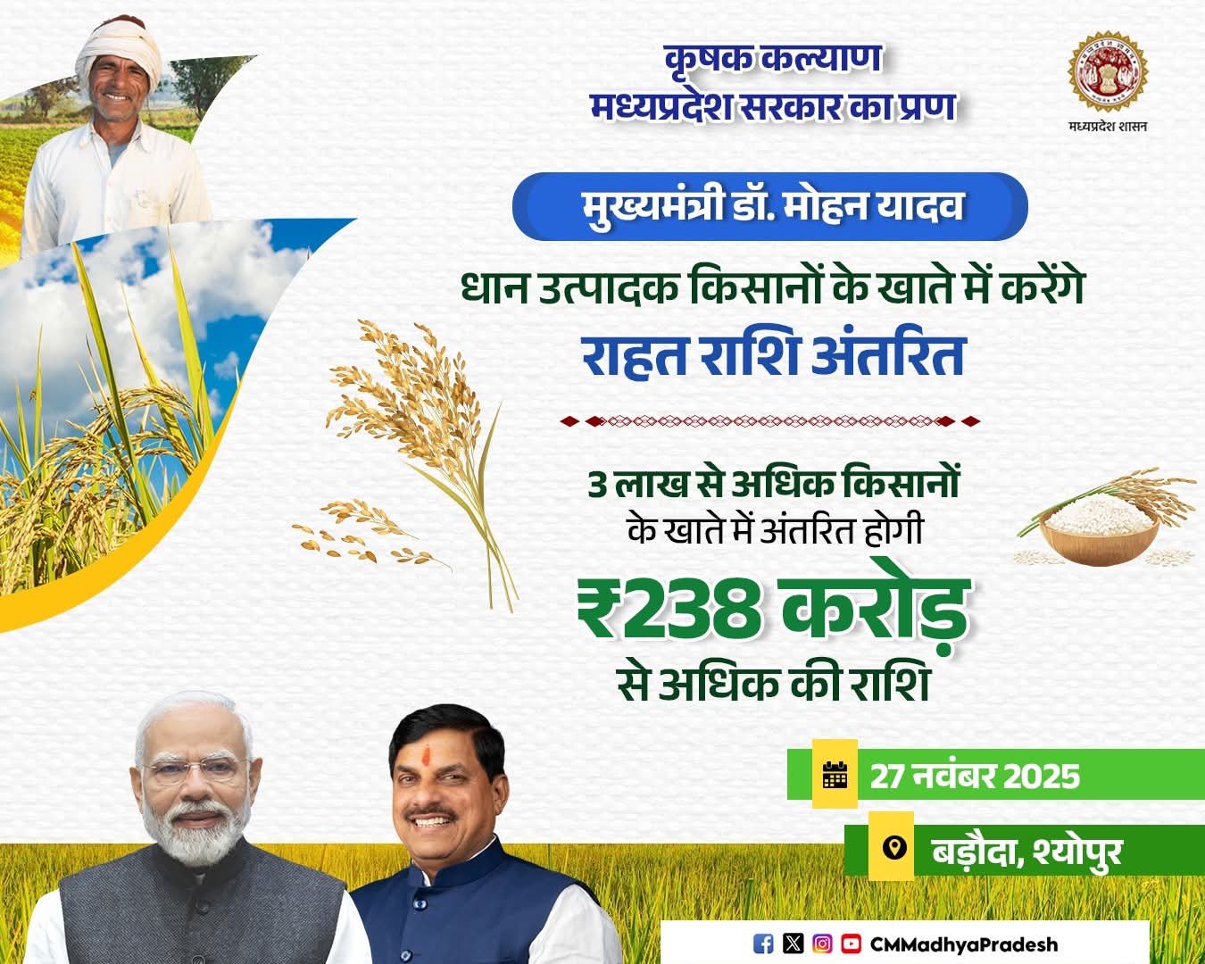 मुख्यमंत्री डॉ मोहन यादव धान उत्पादक किसानों के खातों में करेंगे राहत राशि अंतरित