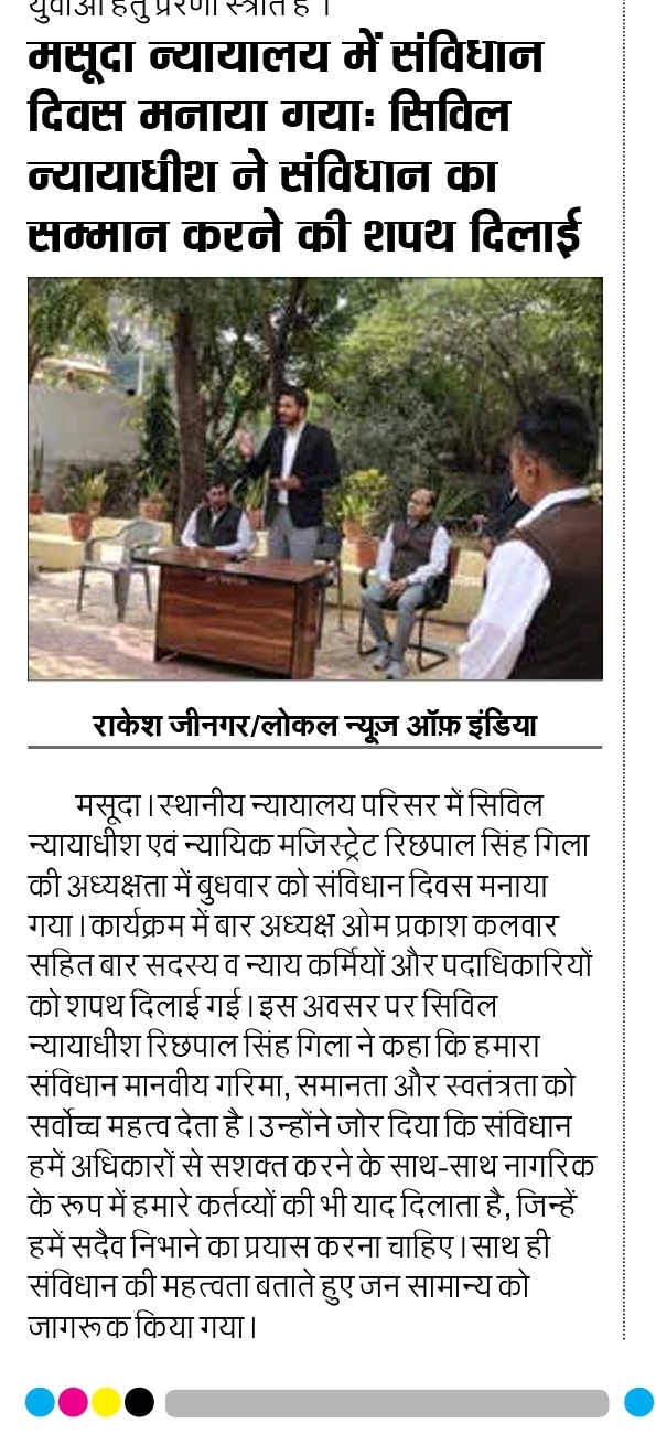 मसूदा न्यायालय में संविधान दिवस मनाया गया: सिविल न्यायाधीश ने संविधान का सम्मान करने की शपथ दिलाई,सिविल न्यायाधीश रिछपाल सिंह गिला