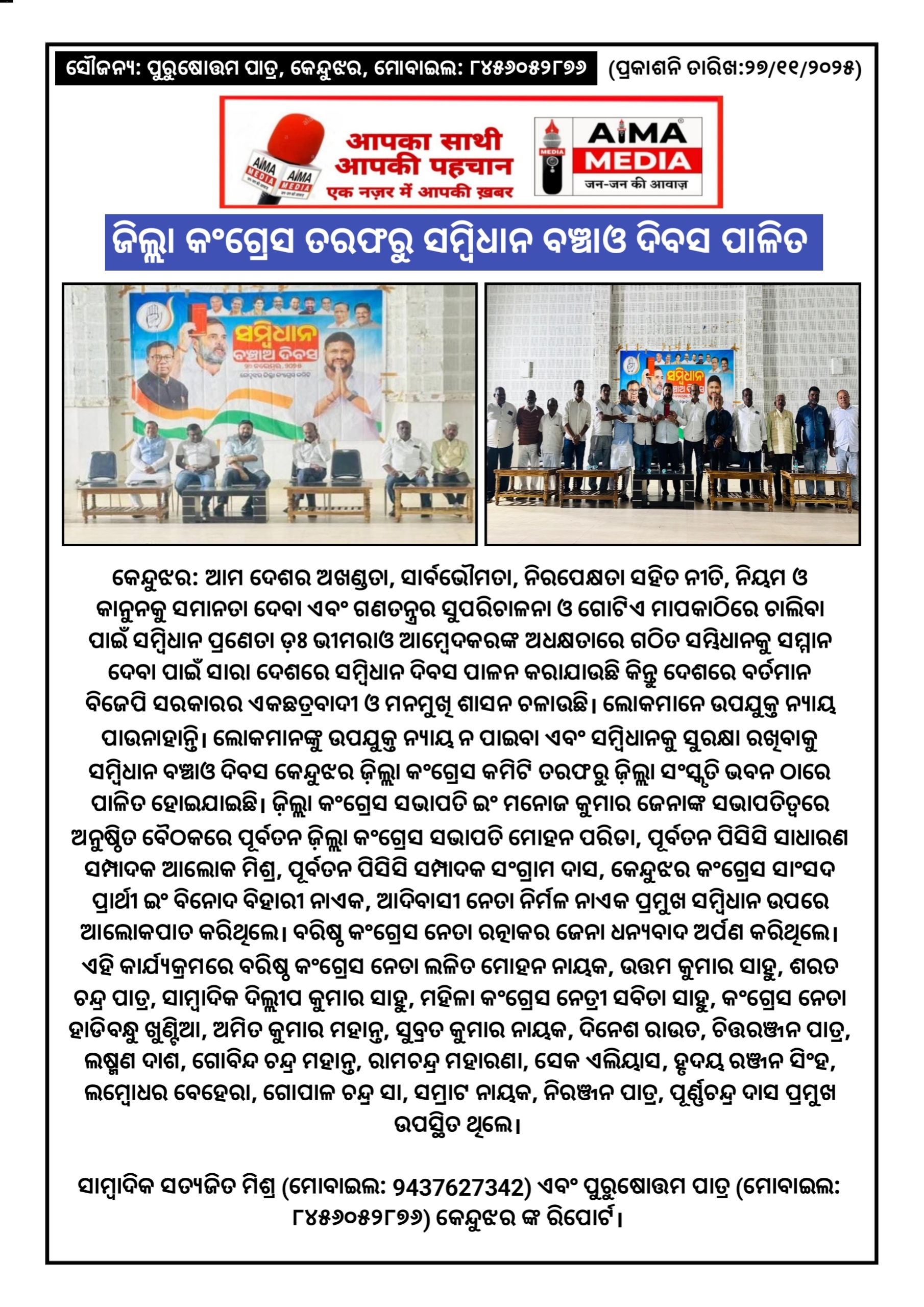 କେନ୍ଦୁଝର: ଆମ ଦେଶର ଅଖଣ୍ଡତା, ସାର୍ବଭୌମତା, ନିରପେକ୍ଷତା ସହିତ ନୀତି, ନିୟମ ଓ କାନୁନକୁ ସମାନତା ଦେବା ଏବଂ ଗଣତନ୍ତ୍ରର ସୁପରିଚାଳନା ଓ ଗୋଟିଏ ମାପକାଠିରେ ଚାଲିବା ପାଇଁ ସମ୍ବିଧାନ ପ୍ରଣେତା ଡ଼ଃ ଭୀମରାଓ ଆମ୍ବେଦକରଙ୍କ ଅଧକ୍ଷତାରେ ଗଠିତ ସମ୍ଭିଧାନକୁ ସମ୍ମାନ ଦେବା ପାଇଁ ସାରା ଦେଶରେ ସମ୍ବିଧାନ ଦିବସ ପାଳନ କରାଯାଉଛି କିନ୍ତୁ ଦେଶରେ ବର୍ତମାନ ବିଜେପି ସରକାରର ଏକଛତ୍ରବାଦୀ ଓ ମନମୁଖି ଶାସନ ଚଳାଉଛି l ଲୋକମାନେ ଉପଯୁକ୍ତ ନ୍ୟାୟ ପାଉନାହାନ୍ତି l ଲୋକମାନଙ୍କୁ ଉପଯୁକ୍ତ ନ୍ୟାୟ ନ ପାଇବା ଏବଂ ସମ୍ବିଧାନକୁ ସୁରକ୍ଷା ରଖିବାକୁ ସମ୍ବିଧାନ ବଞ୍ଚାଓ ଦିବସ କେନ୍ଦୁଝର ଜ଼ିଲ୍ଲା କଂଗ୍ରେସ କମିଟି ତରଫରୁ ଜ଼ିଲ୍ଲା ସଂସ୍କୃତି ଭବନ ଠାରେ ପାଳିତ ହୋଇଯାଇଛି l ଜ଼ିଲ୍ଲା କଂଗ୍ରେସ ସଭାପତି ଇଂ ମନୋଜ କୁମାର ଜେନାଙ୍କ ସଭାପତିତ୍ୱରେ ଅନୁଷ୍ଠିତ ବୈଠକରେ ପୂର୍ବତନ ଜ଼ିଲ୍ଲା କଂଗ୍ରେସ ସଭାପତି ମୋହନ ପରିଡା, ପୂର୍ବତନ ପିସିସି ସାଧାରଣ ସମ୍ପାଦକ ଆଲୋକ ମିଶ୍ର, ପୂର୍ବତନ ପିସିସି ସମ୍ପାଦକ ସଂଗ୍ରାମ ଦାସ, କେନ୍ଦୁଝର କଂଗ୍ରେସ ସାଂସଦ ପ୍ରାର୍ଥୀ ଇଂ ବିନୋଦ ବିହାରୀ ନାଏକ, ଆଦିବାସୀ ନେତା ନିର୍ମଳ ନାଏକ ପ୍ରମୁଖ ସମ୍ବିଧାନ ଉପରେ ଆଲୋକପାତ କରିଥିଲେ l ବରିଷ୍ଠ କଂଗ୍ରେସ ନେତା ରତ୍ନାକର ଜେନା ଧନ୍ୟବାଦ ଅର୍ପଣ କରିଥିଲେ l ଏହି କାର୍ଯ୍ୟକ୍ରମରେ ବରିଷ୍ଠ କଂଗ୍ରେସ ନେତା ଲଳିତ ମୋହନ ନାୟକ, ଉତ୍ତମ କୁମାର ସାହୁ, ଶରତ ଚନ୍ଦ୍ର ପାତ୍ର, ସାମ୍ବାଦିକ ଦିଲ୍ଲୀପ କୁମାର ସାହୁ, ମହିଳା କଂଗ୍ରେସ ନେତ୍ରୀ ସବିତା ସାହୁ, କଂଗ୍ରେସ ନେତା ହାଡିବନ୍ଧୁ ଖୁଣ୍ଟିଆ, ଅମିତ କୁମାର ମହାନ୍ତ, ସୁବ୍ରତ କୁମାର ନାୟକ, ଦିନେଶ ରାଉତ, ଚିତ୍ତରଞ୍ଜନ ପାତ୍ର, ଲଷ୍ମଣ ଦାଶ, ଗୋବିନ୍ଦ ଚନ୍ଦ୍ର ମହାନ୍ତ, ରାମଚନ୍ଦ୍ର ମହାରଣା, ସେକ ଏଲିୟାସ, ହୃଦୟ ରଞ୍ଜନ ସିଂହ, ଲମ୍ବୋଧର ବେହେରା, ଗୋପାଳ ଚନ୍ଦ୍ର ସା, ସମ୍ରାଟ ନାୟକ, ନିରଞ୍ଜନ ପାତ୍ର, ପୂର୍ଣ୍ଣଚନ୍ଦ୍ର ଦାସ ପ୍ରମୁଖ ଉପସ୍ଥିତ ଥିଲେ l