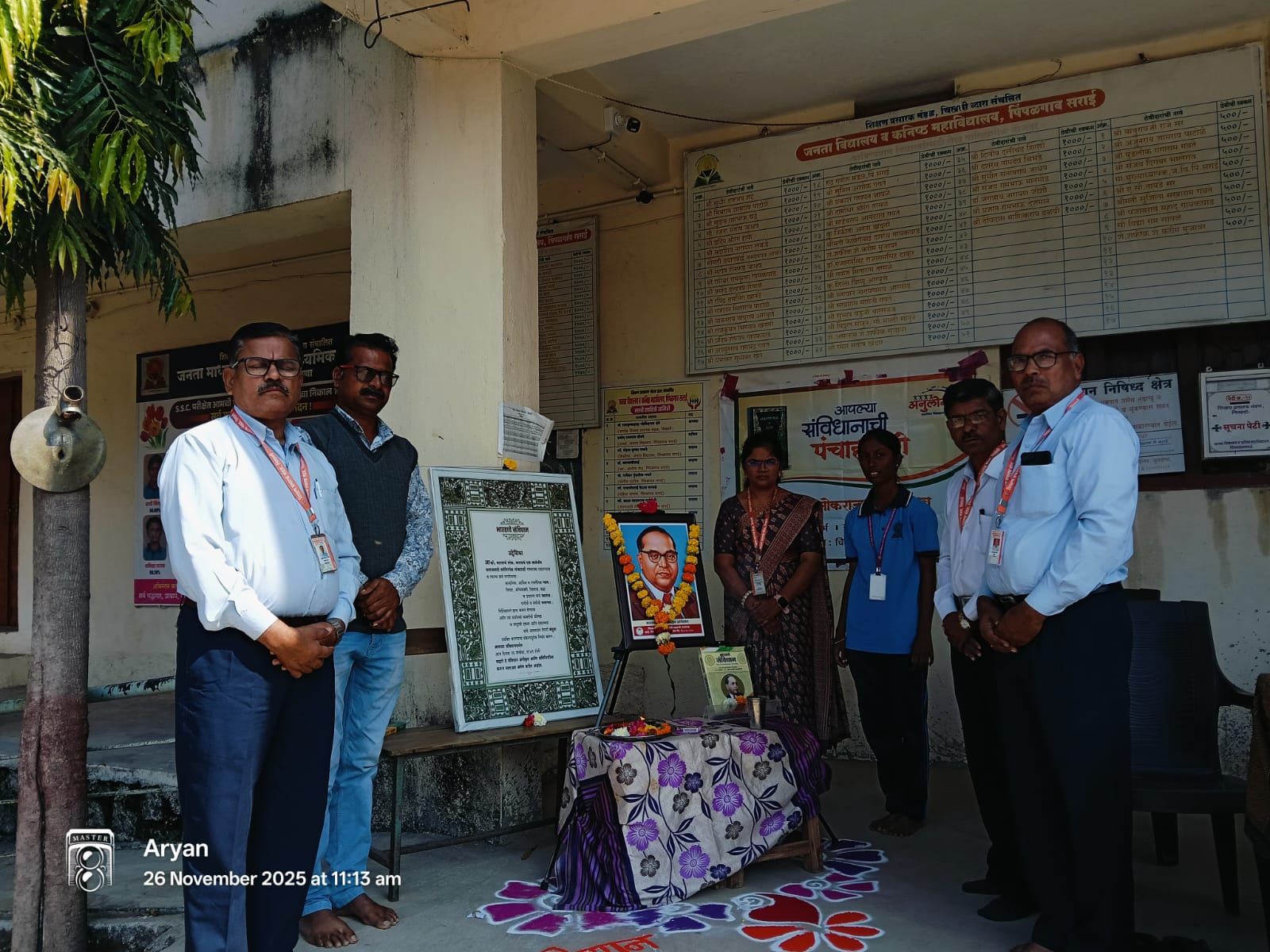 पिंपळगाव सराई : जनता विद्यालय पिंपळगाव सराई येथे २६ नोव्हेंबर २०२५ रोजी संविधान दिन सप्ताहाचा समारोप उत्साहात संपन्न झाला. कार्यक्रमाच्या सुरुवातीला महामानव भारतरत्न डॉ. बाबासाहेब आंबेडकर यांच्या प्रतिमेचे आणि भारतीय संविधानाच्या प्रतीचे पूजन करण्यात आले. यानंतर भारतीय संविधानाच्या प्रास्ताविकेचे वाचन सर्वांनी एकत्रितपणे करत लोकशाही मूल्यांप्रती निष्ठा व्यक्त केली.