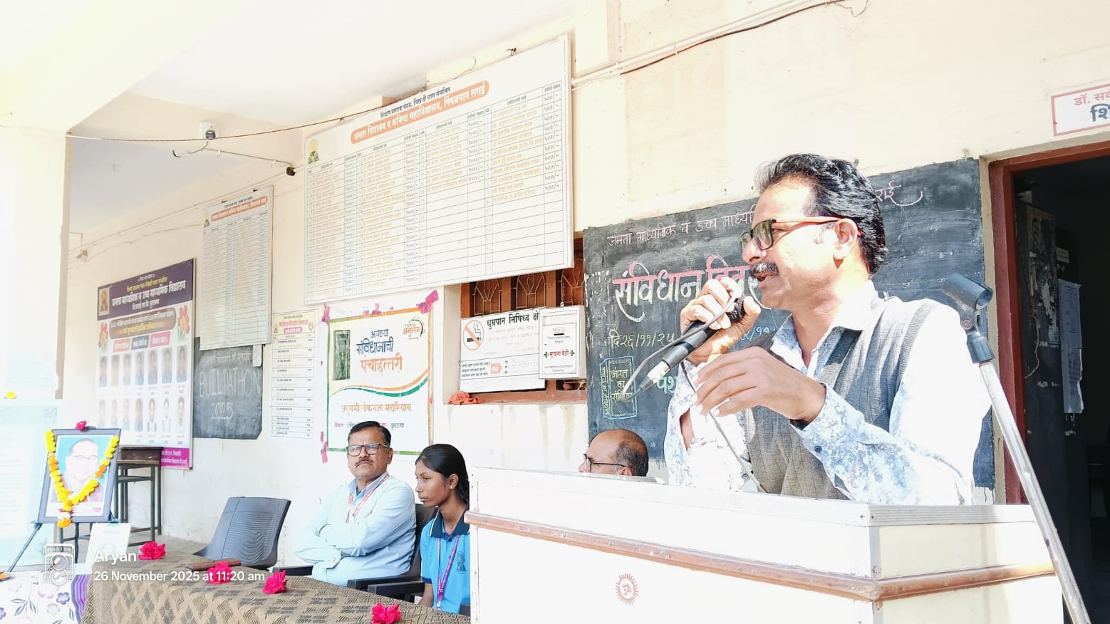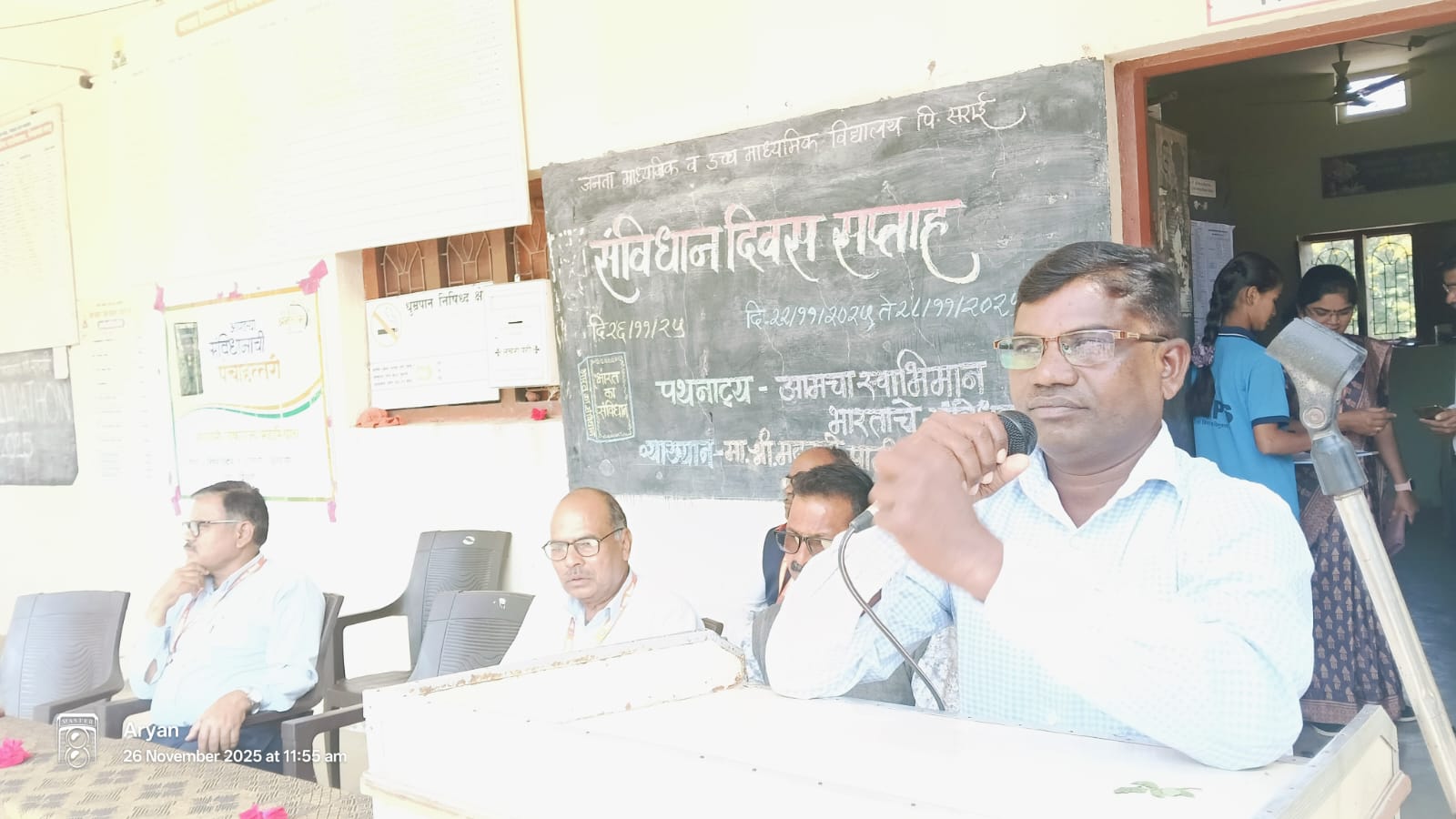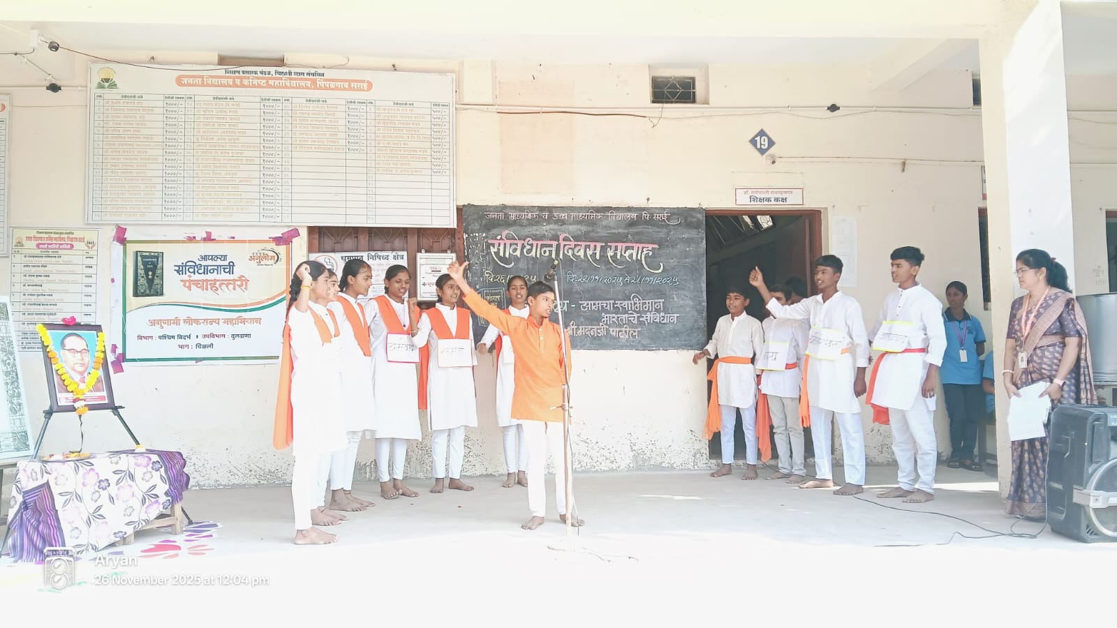 या कार्यक्रमामध्ये विद्यालयातील १३ विद्यार्थ्यांनी संविधान दिनाविषयी माहितीपर मांडणी आणि प्रभावी भाषणे सादर केली. शिवव्याख्याते मदन पाटील यांनी आपल्या भाषणात सांगितले की, “आपल्या वैभवशाली संस्कृतीचे प्रतिबिंब डॉक्टर बाबासाहेबांनी आपल्या संविधानामध्ये उतरवलेलं आहे. भारतीय संविधान हे फक्त कायद्यांचे पुस्तक नाही, तर सामान्य माणसाच्या स्वाभिमानाचे जिवंत घोषणापत्र आहे. या संविधानाने या देशातील शेवटच्या घटकाला अधिकार, समानता आणि न्याय दिला. लोकशाहीच्या या पवित्र दस्तऐवजाचे रक्षण करणे हे प्रत्येक नागरिकाचे कर्तव्य आहे.”