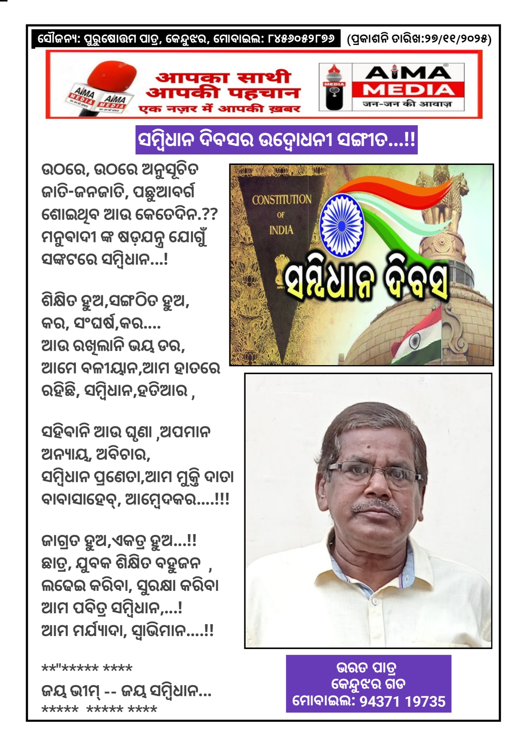 "ସମ୍ବିଧାନ ଦିବସର ଉଦ୍ଵୋଧନୀ ସଙ୍ଗୀତ"- ଲେଖକ, କବି ତଥା ବରିଷ୍ଠ ନାଗରିକ ଭରତ ପାତ୍ର ଙ୍କ ଦ୍ଵାରା ରଚିତ କବିତା।