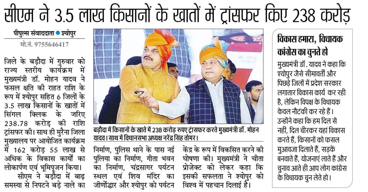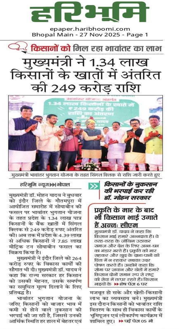 मुख्यमंत्री डॉ मोहन यादव ने किसानों को दी 249 करोड़ की भावान्तर राशि
