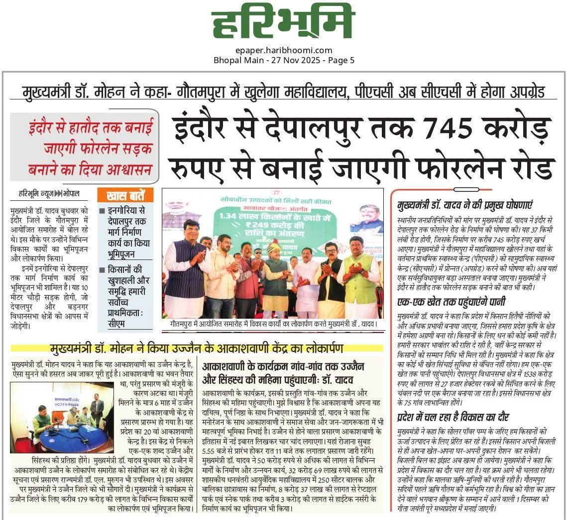 मुख्यमंत्री डॉ.मोहन यादव ने किसानों को दी 249 करोड़ की भावान्तर राशि इंदौर से देपालपुर तक ₹745 करोड़ से बनाई जाएगी फोरलेन रोड #JansamparkMP