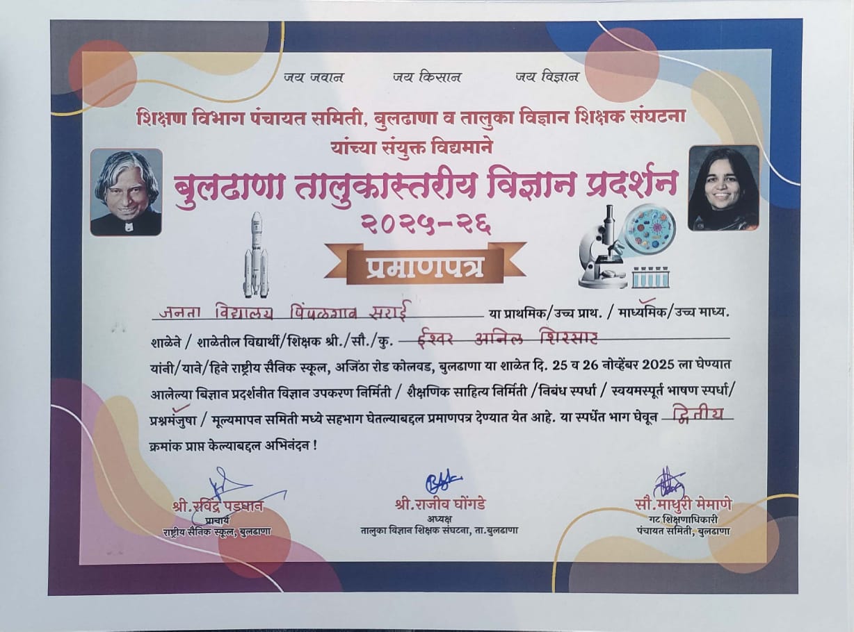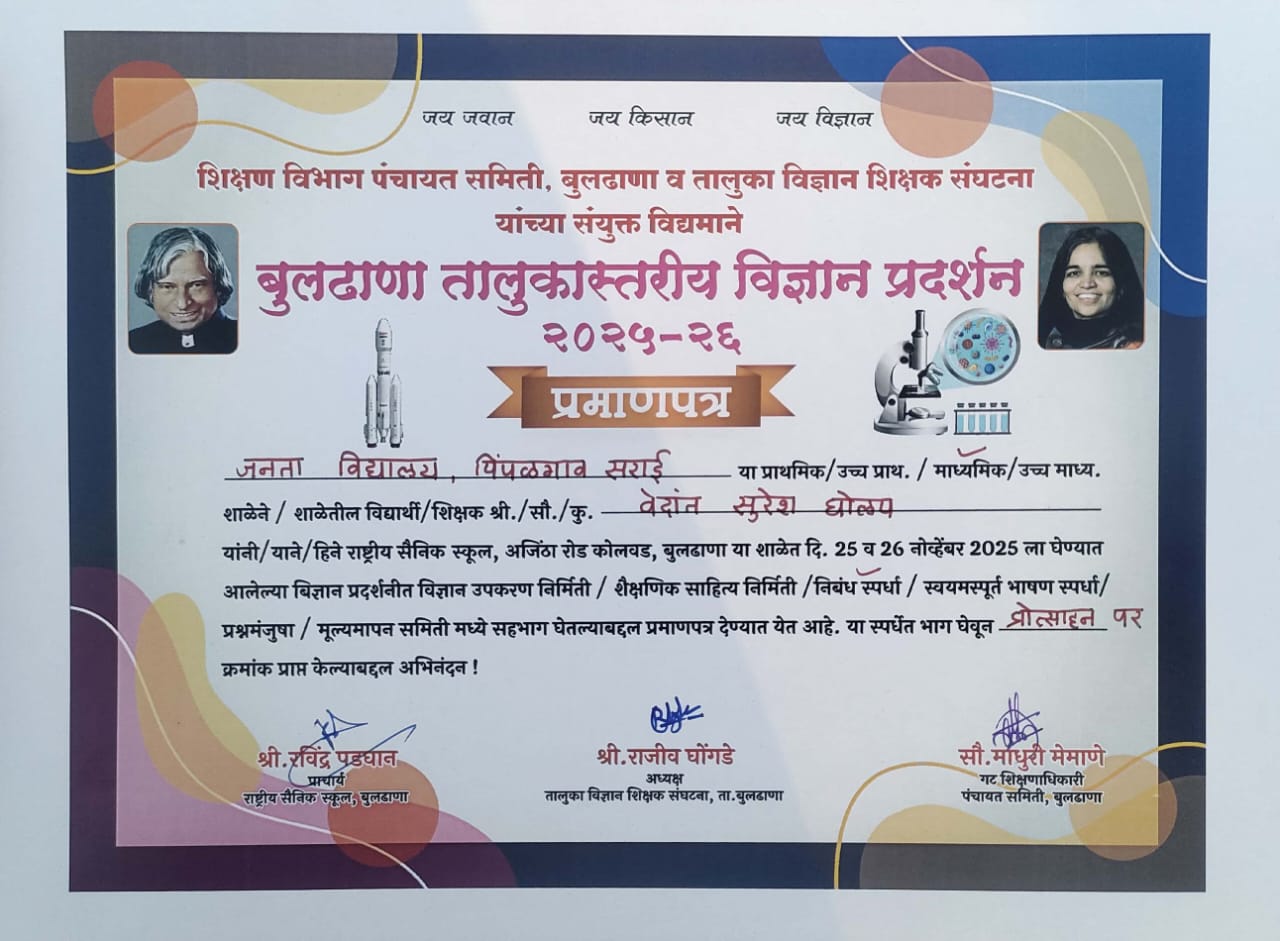 राष्ट्रीय सैनिक स्कूल येथे २५ व २६ नोव्हेंबर रोजी आयोजित बुलडाणा तालुकास्तरीय विज्ञान प्रदर्शनीत पिंपळगाव सराई येथील जनता विद्यालयाने चमकदार यश मिळवत आपला ठसा उमटविला. विविध उपक्रमांत विद्यार्थ्यांनी तसेच शिक्षकांनी उत्कृष्ट कौशल्य आणि विज्ञानविषयक जाण दाखवत लक्षवेधी कामगिरी केली.या प्रदर्शनीत इयत्ता ९ वीचे विद्यार्थी वेदांत सुरेश घोलप याने निबंध स्पर्धेत प्रभावी मांडणी सादर करून प्रोत्साहन पारितोषिक पटकावले. तर इयत्ता १० वीतील ईश्वर अनिल सिरसाट याने प्रश्नमंजुषा स्पर्धेत उल्लेखनीय ज्ञानप्रदर्शन करत द्वितीय क्रमांक मिळविला.विद्यालयाचे विज्ञान शिक्षक सुहास कुलकर्णी यांनी ‘शैक्षणिक साहित्य निर्मिती – माध्यमिक गट’ या स्पर्धेत नाविन्यपूर्ण आणि उपयुक्त शैक्षणिक साहित्य सादर करून द्वितीय क्रमांक मिळवत शिक्षकांसाठीही प्रेरणादायी आदर्श निर्माण केला.या यशामुळे विद्यालयात उत्साहाचे वातावरण पसरले असून विद्यार्थ्यांच्या परिश्रमाचे सर्वत्र कौतुक होत आहे. विजेत्या विद्यार्थी आणि शिक्षकांचा शिक्षण प्रसारक मंडळाचे अध्यक्ष रामकृष्णदादा शेटे, सचिव प्रेमराजजी भाला, जनता विद्यालयाचे प्राचार्य प्रमोद ठोंबरे, पर्यवेक्षक संजय पिवटे तसेच सर्व सहकारी शिक्षक व संस्थेचे पदाधिकारी यांनी अभिनंदन करून पुढील वाटचालीस शुभेच्छा दिल्या.या उल्लेखनीय कामगिरीमुळे पिंपळगाव सराईच्या शैक्षणिक गुणवत्तेची पुन्हा एकदा प्रचिती आली असून विज्ञान उपक्रमांबाबत विद्यार्थ्यांमध्ये नवचैतन्य निर्माण झाले आहे.