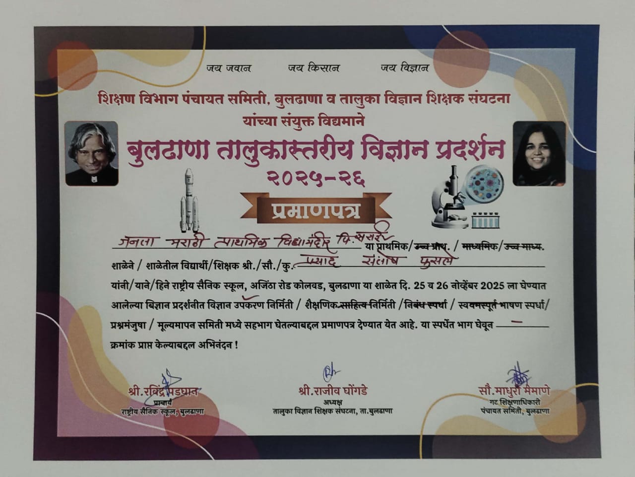 शिक्षण विभाग पंचायत समिती बुलडाणा आणि तालुका विज्ञान शिक्षक संघटना यांच्या संयुक्त विद्यमाने आयोजित बुलडाणा तालुकास्तरीय विज्ञान प्रदर्शनी इ.स. २०२५-२६ ही दिनांक २५ व २६ नोव्हेंबर २०२५ रोजी राष्ट्रीय सैनिक स्कूल, राजीव गांधी मिलिटरी स्कूल, अजिंठा रोड, कोलवड,