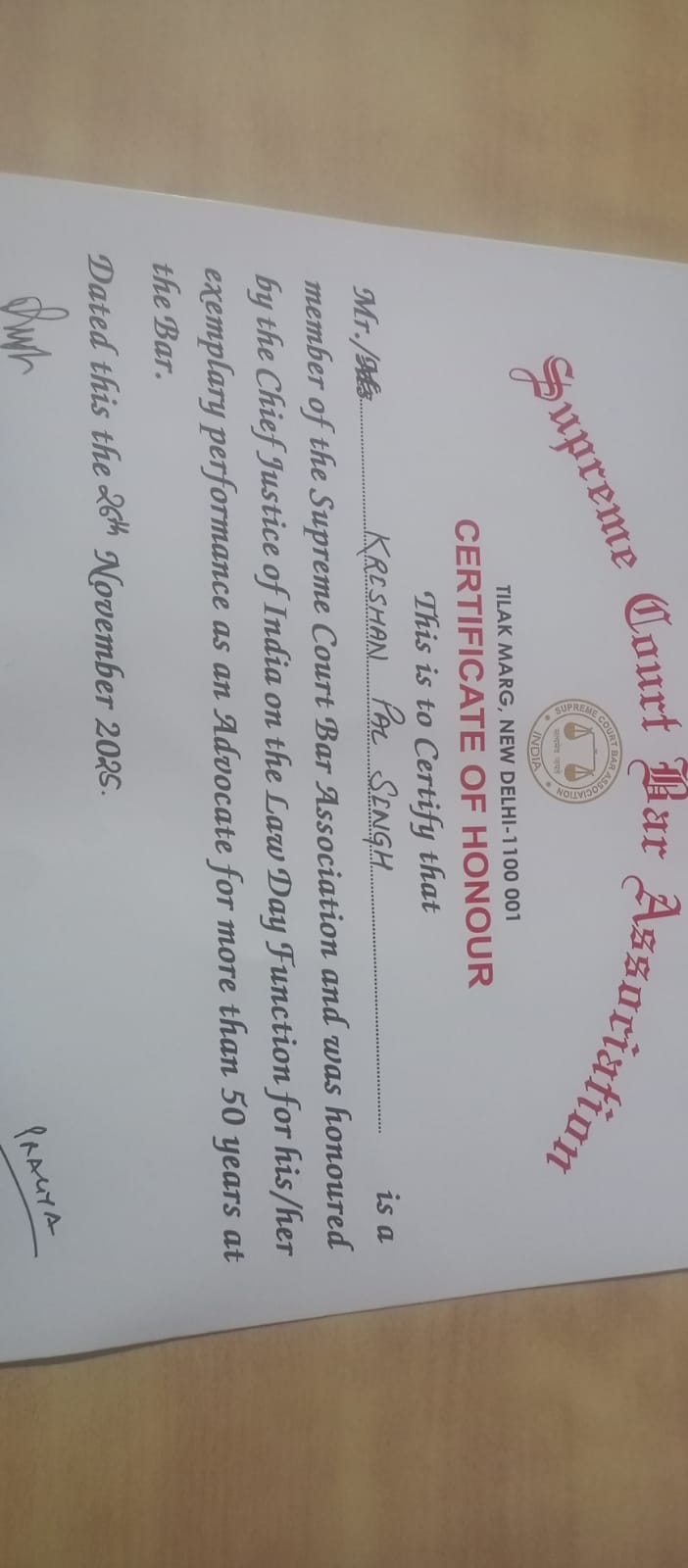 Supreme Court Bar Association (SCBA) ORGANISED " LAW DAY" function at Supreme Court Lawns on 26.11.25 honored national law secretary senior advocate Mr. K P.Singh ji (Ghaziabad chamber number 653) by the Chief Justice of India, Justice Surya kant, Union Law & Justice Minister Sri Arjun Singh Sri Rahul kaushik VICE PRESIDENT of SCBA, & Solicitor General of India Tusar Kant ji .