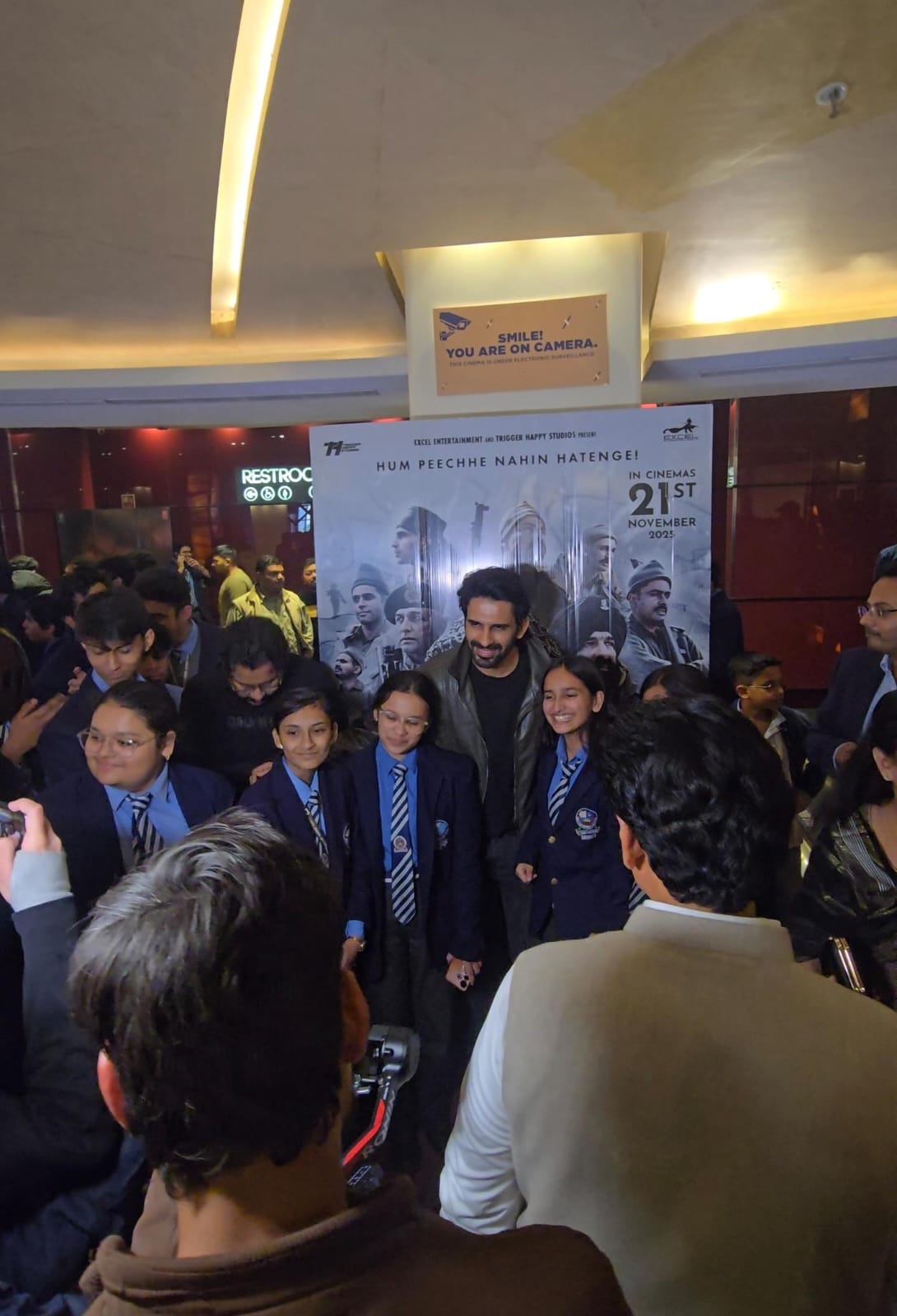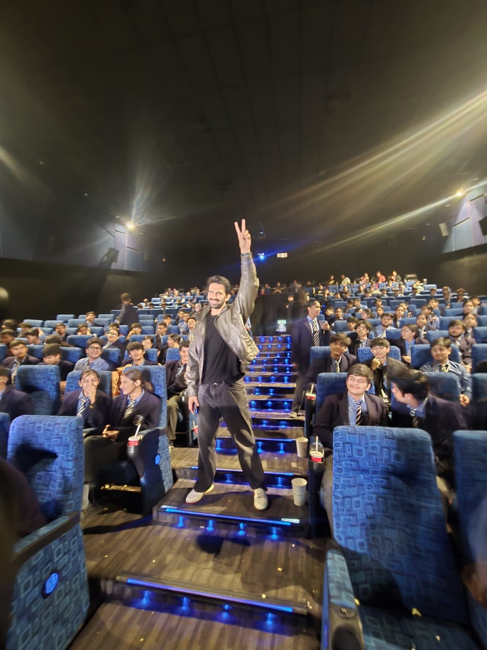 मेरठ में फ़िल्म "120 बहादुर" देखते हुए फ़िल्म के एक्टर अंकित सिवाच को अपने बीच पा प्रफुल्लित हुए सेंट मैरिज के स्टूडेंट