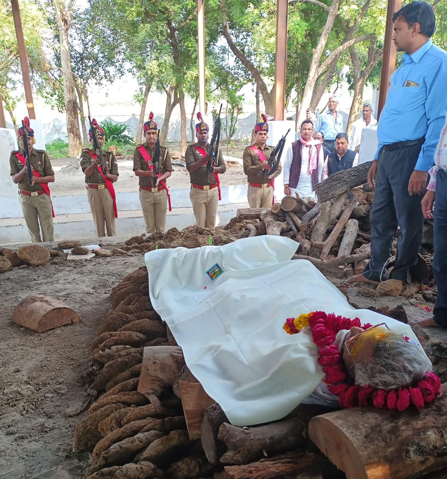 शव यात्रा में खेरागढ़ विधायक भगवान सिंह कुशवाहा, चेयरमैन सुधीर गर्ग गुड्डू, सामाजिक संगठनों के प्रतिनिधि, व्यापारी, सामाजिक व्यक्ति और क्षेत्रवासी शामिल हुए। मोक्षधाम में विधायक भगवान सिंह कुशवाहा और तहसीलदार सतेंद्र सिकरवार ने राजकीय सम्मान के साथ पुष्पचक्र अर्पित किया। इस दौरान पुलिस गारद द्वारा सलामी दी गई, जिसने वातावरण को और अधिक भावुक बना दिया।