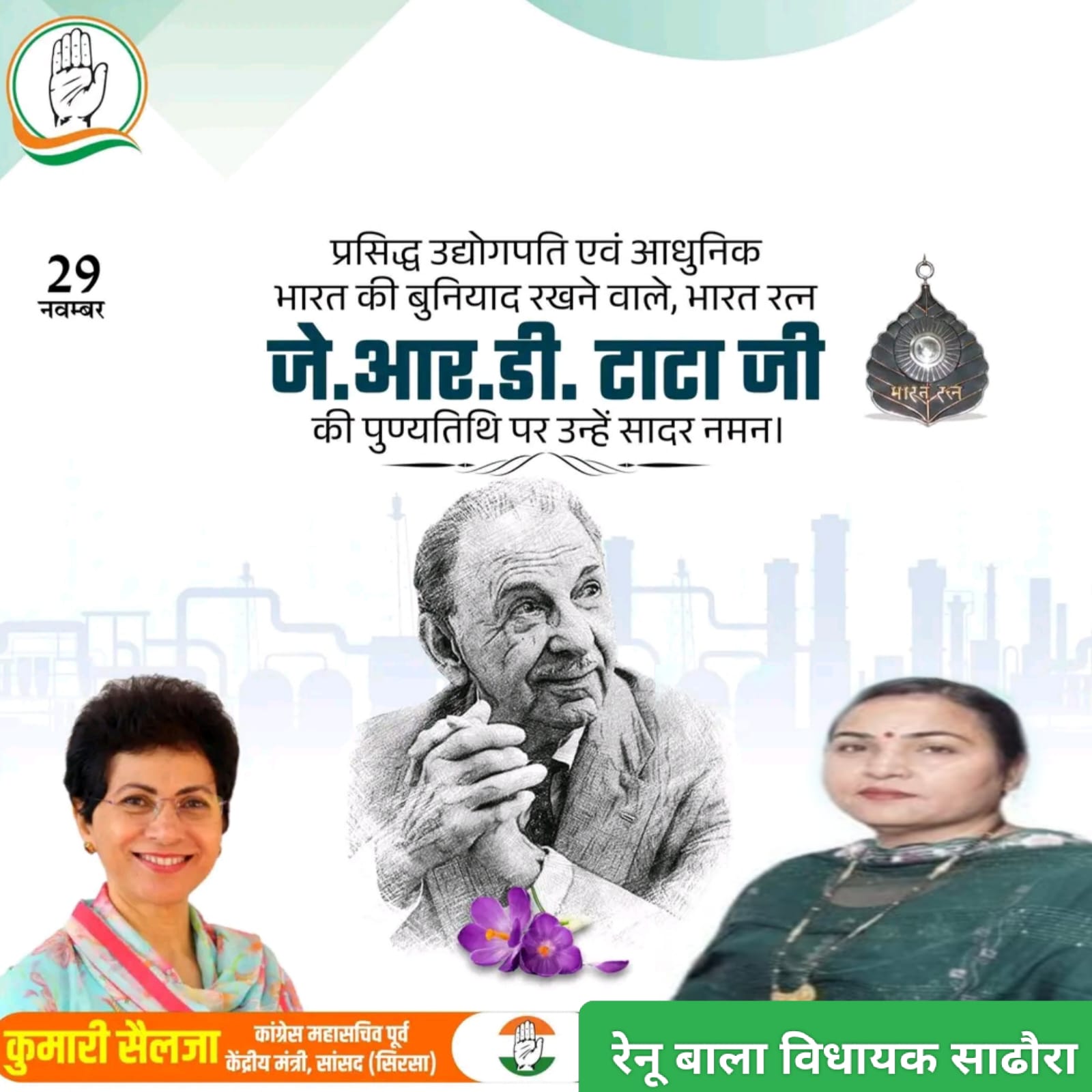 कपुरी :- आज 29 नवंबर 2025, हल्का सधौरा विधायक मैडम रेणु बाला जी नें "टाटा" जी को श्रद्धांजलि पेश की, "भारतीय उद्योग, रोजगार एवं विमानन क्षेत्र को नई दिशा देने वाले महान दूरदर्शी