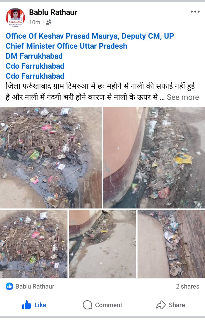 जिला फर्रुखाबाद में ग्राम पंचायत टिमरूआ में छः महीने से नाली सफाई नहीं हुई है और गाव बारे लगातार शिकायत कर है लेकिन अभी तक किसी प्रकार कोई कार्यवाही नहीं हुई
