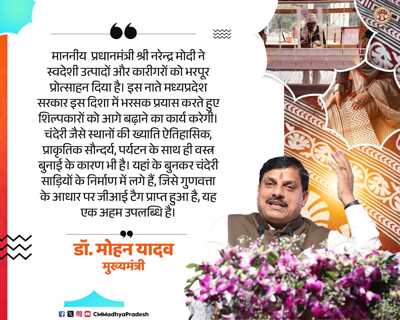 माननीय प्रधानमंत्री श्री Narendra Modi जी ने स्वदेशी उत्पादों और कारीगरों को भरपूर प्रोत्साहन दिया है। मध्यप्रदेश सरकार इस दिशा में भरसक प्रयास करते हुए शिल्पकारों को आगे बढ़ाने का कार्य करेगी : CM