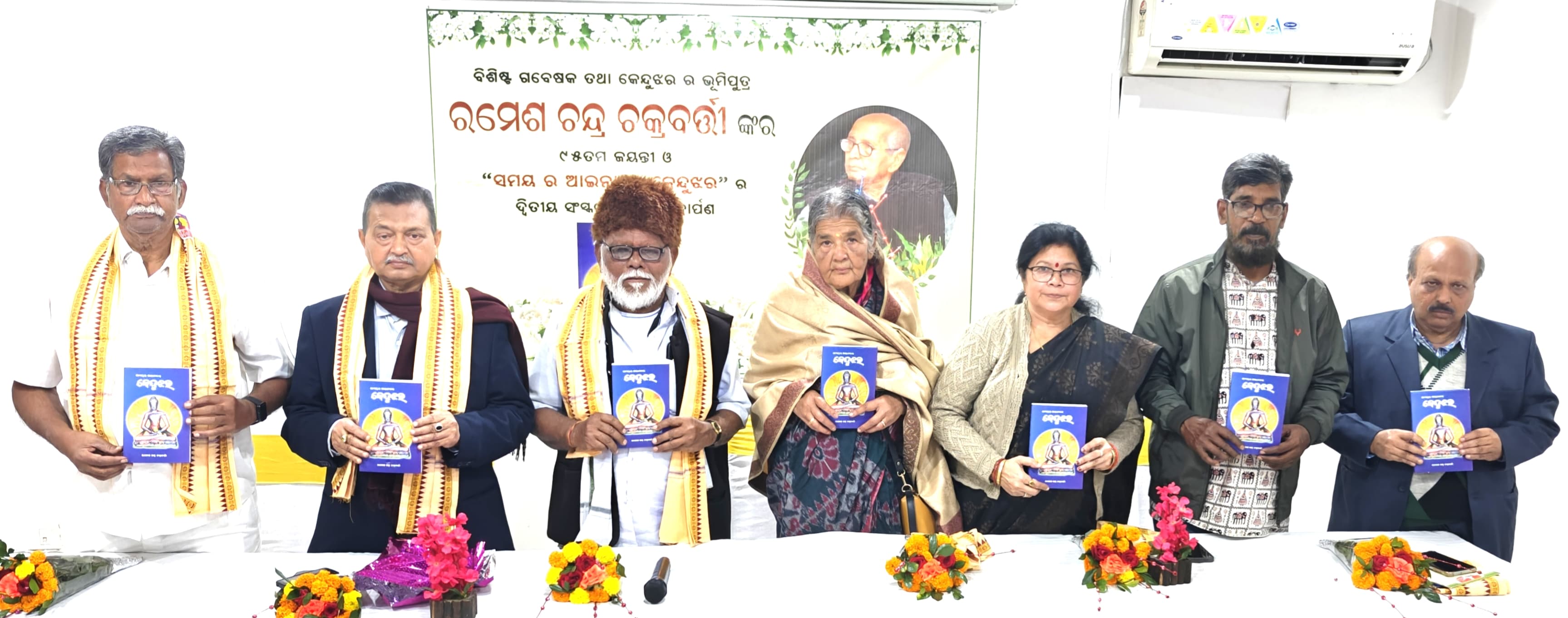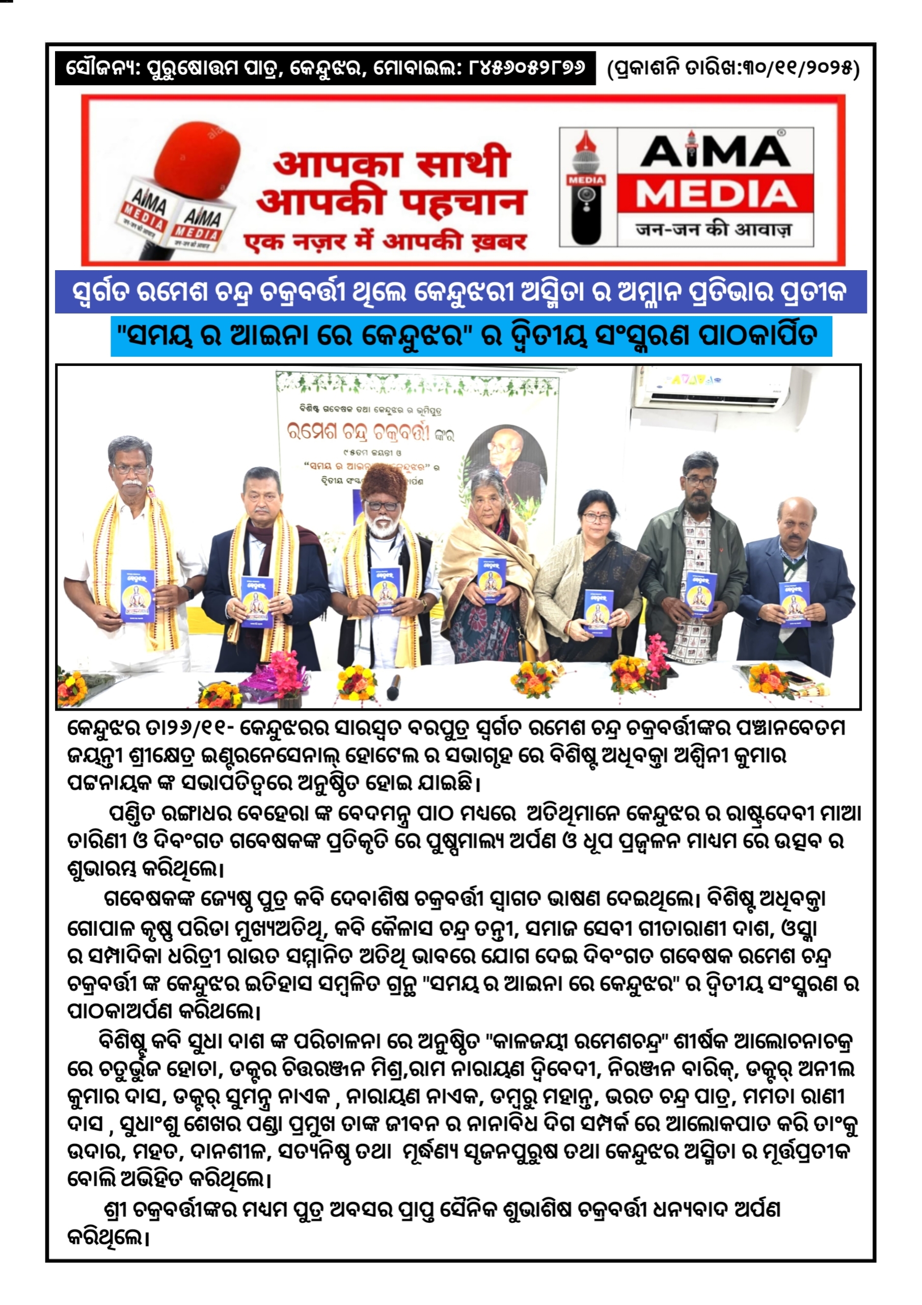 ଗବେଷକଙ୍କ ଜ୍ୟେଷ୍ଠ ପୁତ୍ର କବି ଦେବାଶିଷ ଚକ୍ରବର୍ତ୍ତୀ ସ୍ୱାଗତ ଭାଷଣ ଦେଇଥିଲେ। ବିଶିଷ୍ଟ ଅଧିବକ୍ତା ଗୋପାଳ କୃଷ୍ଣ ପରିଡା ମୁଖ୍ୟଅତିଥି, କବି କୈଳାସ ଚନ୍ଦ୍ର ତନ୍ତୀ, ସମାଜ ସେବୀ ଗୀତାରାଣୀ ଦାଶ, ଓସ୍କା ର ସମ୍ପାଦିକା ଧରିତ୍ରୀ ରାଉତ ସମ୍ମାନିତ ଅତିଥି ଭାବରେ ଯୋଗ ଦେଇ ଦିବଂଗତ ଗବେଷକ ରମେଶ ଚନ୍ଦ୍ର ଚକ୍ରବର୍ତ୍ତୀ ଙ୍କ କେନ୍ଦୁଝର ଇତିହାସ ସମ୍ବଳିତ ଗ୍ରନ୍ଥ "ସମୟ ର ଆଇନା ରେ କେନ୍ଦୁଝର" ର ଦ୍ଵିତୀୟ ସଂସ୍କରଣ ର ପାଠକାଅର୍ପଣ କରିଥଲେ।