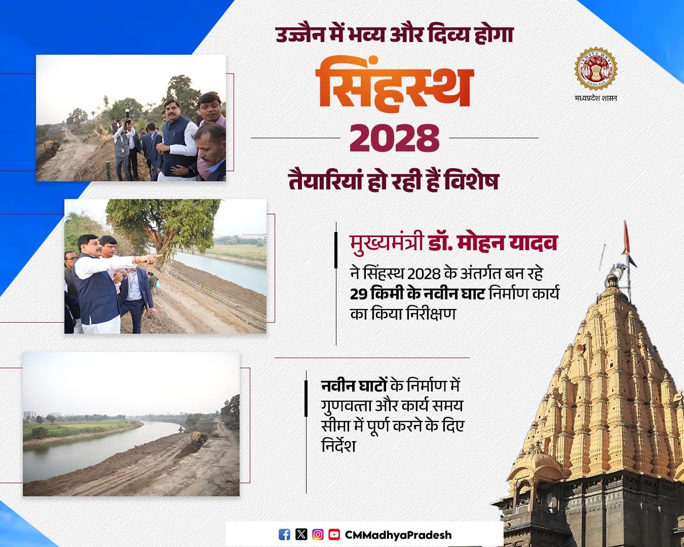 मुख्यमंत्री डॉ. मोहन यादव ने सिंहस्थ: 2028 में बेहतर प्रबंधन के लिए 29 किलोमीटर में बन रहे नवीन घाटों के निर्माण स्थल का निरीक्षण कर जरूरी दिशा-निर्देश दिए।