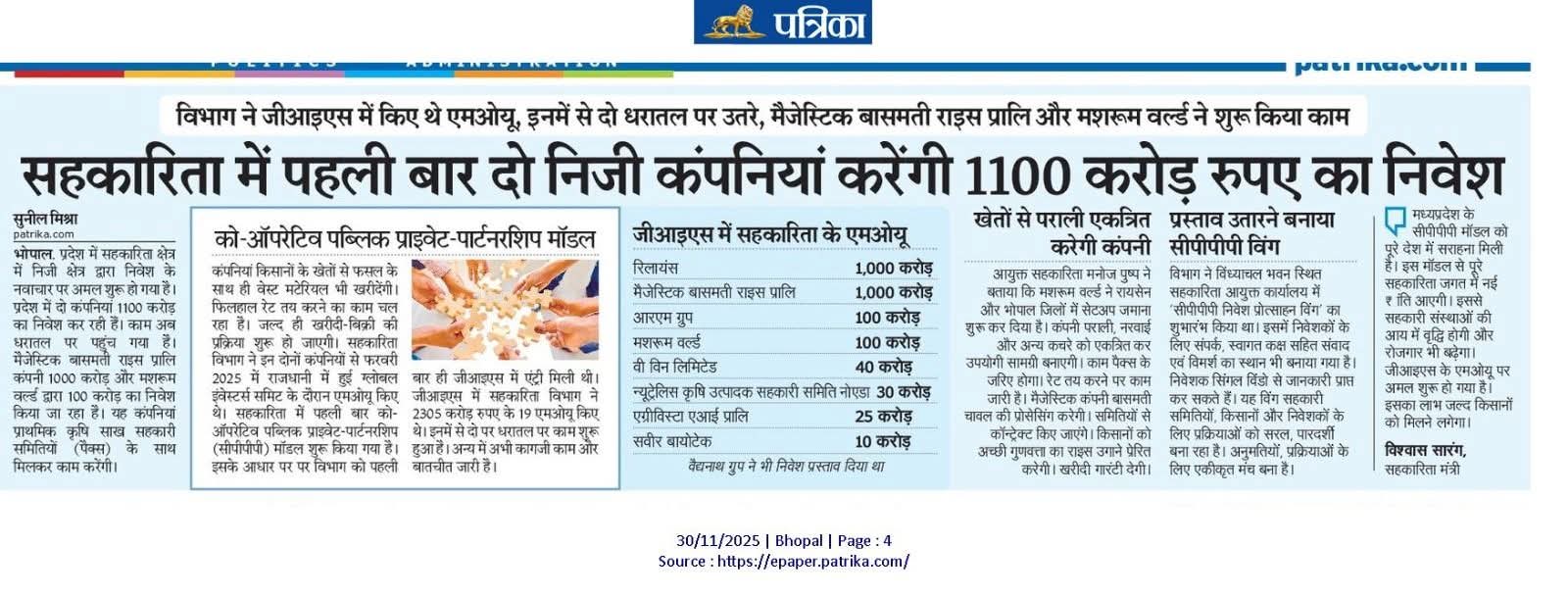सहकारिता में पहली बार दो निजी कंपनियां करेंगी ₹1100 करोड़ का निवेश