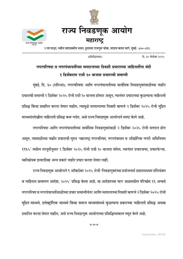 महाराष्ट्र राज्यातील नगरपरिषद आणि नगरपंचायतींच्या सार्वत्रिक निवडणुकांसाठीचा अधिकृत प्रचार 1 डिसेंबर 2025 रोजी रात्री 10 वाजता समाप्त झाला आहे.