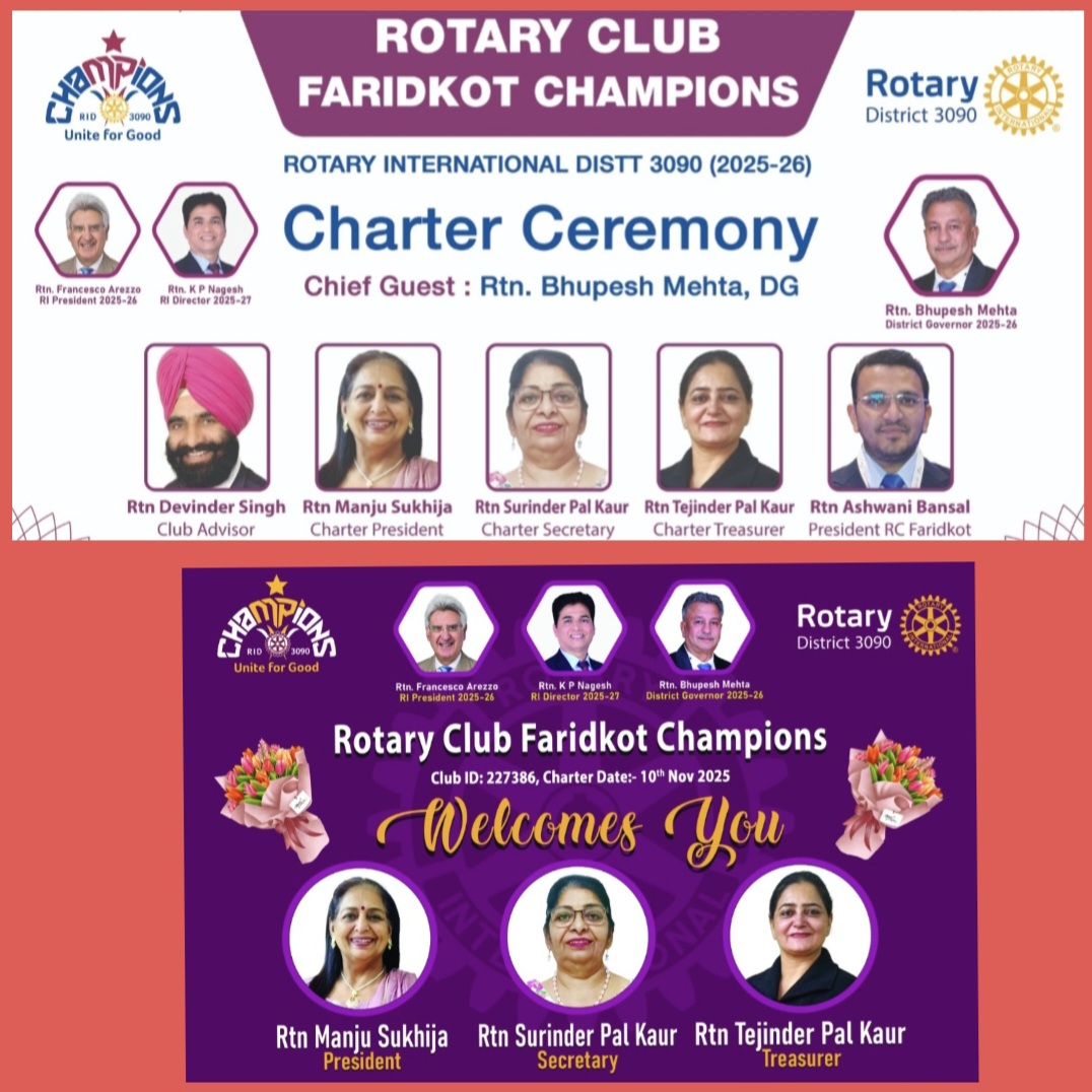 ਰੋਟੇਰੀਅਨ ਭੁਪੇਸ਼ ਮਹਿਤਾ ਡਿਸਟ੍ਰਿਕ ਗਵਰਨਰ ਰੋਟਰੀ ਕਲੱਬ ਵੱਲੋ ਰੋਟਰੀ ਕਲੱਬ ਫਰੀਦਕੋਟ ਚੈਂਪੀਅਨ ਨਵੇਂ ਕਲੱਬ ਦੀ ਚਾਰਟਰ ਸੈਰੇਮਨੀ 01 ਦਸੰਬਰ ਨੂੰ ...ਅਸ਼ਵਨੀ ਬਾਂਸਲ