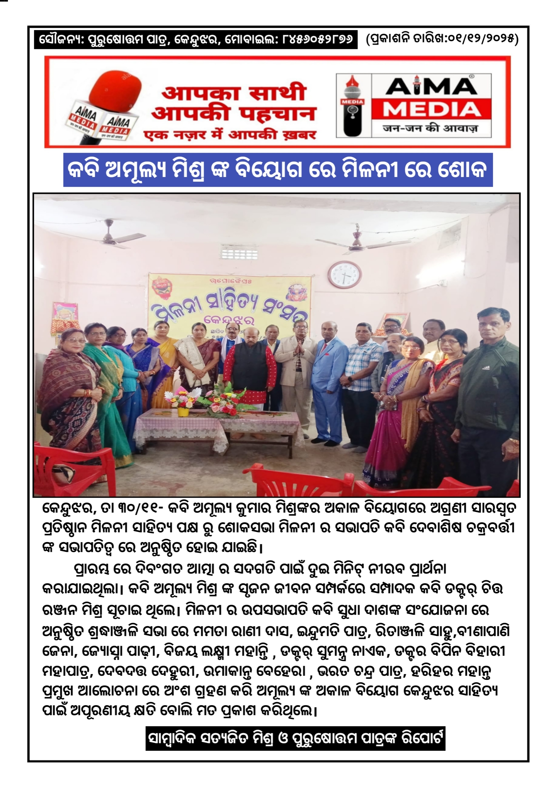 କବି ଅମୂଲ୍ୟ ମିଶ୍ର ଙ୍କ ବିୟୋଗ ରେ ମିଳନୀ ରେ ଶୋକ!