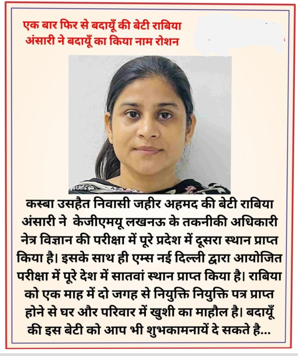 कस्बा उसहैत निवासी जहीर अहमद की बेटी राबिया अंसारी ने केजीएमयू लखनऊ के तकनीकी अधिकारी नेत्र विज्ञान की परीक्षा में पूरे प्रदेश में दूसरा स्थान प्राप्त किया है। इसके साथ ही एम्स नई दिल्ली द्वारा आयोजित परीक्षा में पूरे देश में सातवां स्थान प्राप्त किया है। राबिया को एक माह में दो जगह से नियुक्ति नियुक्ति पत्र प्राप्त होने से घर और परिवार में खुशी का माहौल है। बदायूँ की इस बेटी को आप भी शुभकामनायें दे सकते है...