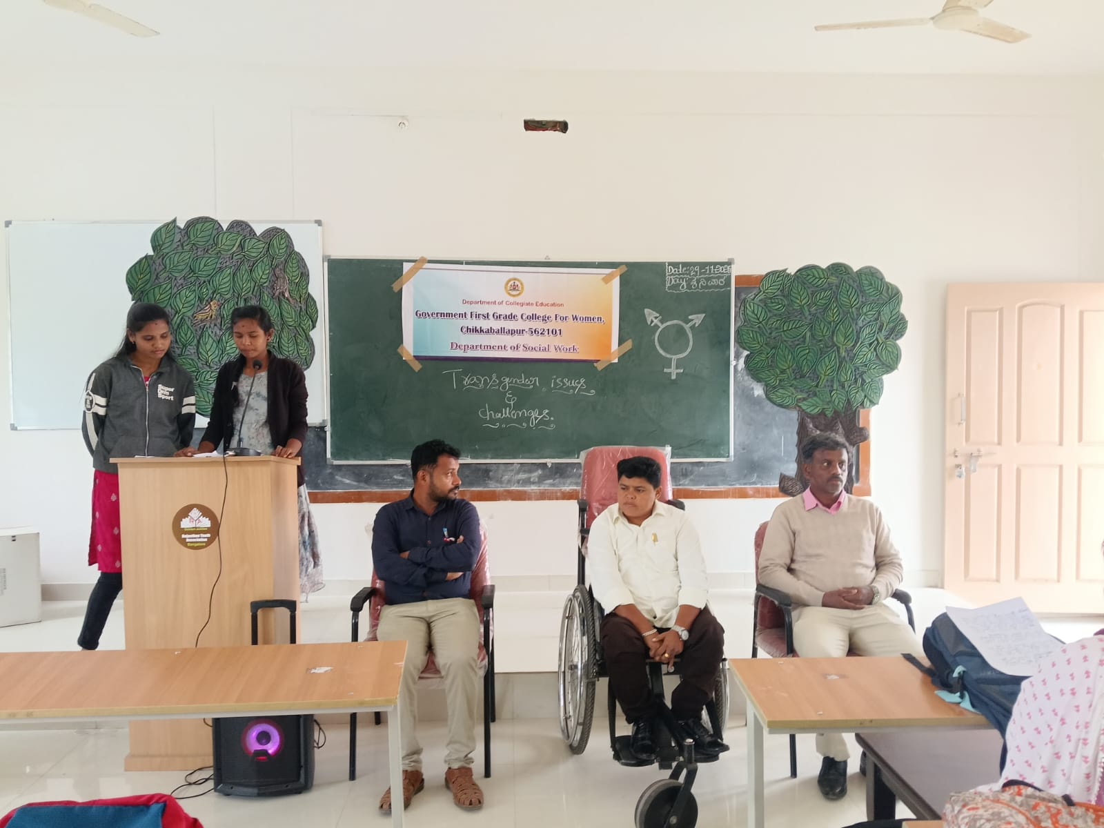 ಸರ್ಕಾರಿ ಪ್ರಥಮ ದರ್ಜೆ ಮಹಿಳಾ ಕಾಲೇಜು ಚಿಕ್ಕಬಳ್ಳಾಪುರ ಸಮಾಜ ಕಾರ್ಯ ವಿಭಾಗದ ವತಿಯಿಂದ ತೃತಿಯ ಲಿಂಗಿಗಳ ಸವಾಲು ಮತ್ತು ಸಮಸ್ಯೆಗಳನ್ನು ಕುರಿತು ಉಪನ್ಯಾಸ ಕಾರ್ಯಕ್ರಮ