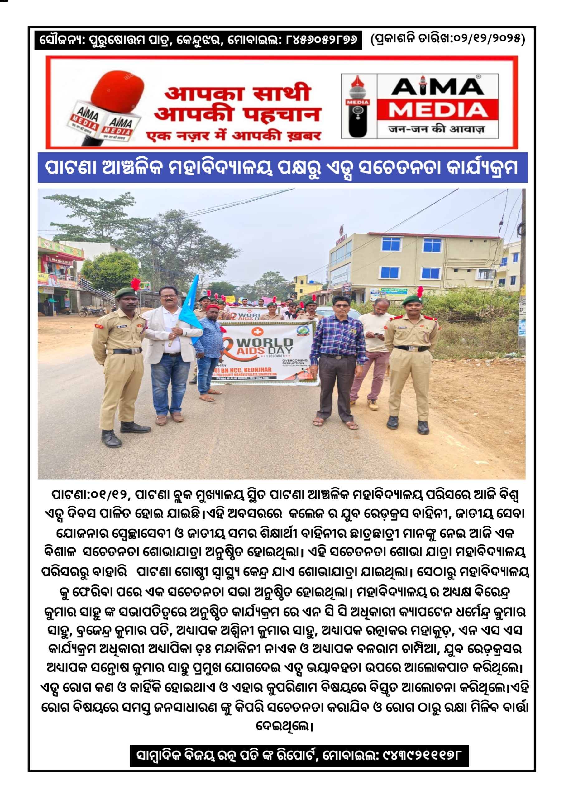 ପାଟଣା:୦୧/୧୨, ପାଟଣା ବ୍ଲକ ମୁଖ୍ୟାଳୟ ସ୍ଥିତ ପାଟଣା ଆଞ୍ଚଳିକ ମହାବିଦ୍ୟାଳୟ ପରିସରେ ଆଜି ବିଶ୍ୱ ଏଡ୍ସ ଦିବସ ପାଳିତ ହୋଇ ଯାଇଛି। ଏହି ଅବସରରେ କଲେଜ ର ଯୁବ ରେଡ଼କ୍ରସ ବାହିନୀ, ଜାତୀୟ ସେବା ଯୋଜନାର ସ୍ବେଚ୍ଛାସେବୀ ଓ ଜାତୀୟ ସମର ଶିକ୍ଷାର୍ଥୀ ବାହିନୀର ଛାତ୍ରଛାତ୍ରୀ ମାନଙ୍କୁ ନେଇ ଆଜି ଏକ ବିଶାଳ ସଚେତନତା ଶୋଭାଯାତ୍ରା ଅନୁଷ୍ଠିତ ହୋଇଥିଲା।ଏହି ସଚେତନତା ଶୋଭା ଯାତ୍ରା ମହାବିଦ୍ୟାଳୟ ପରିସରରୁ ବାହାରି ପାଟଣା ଗୋଷ୍ଠୀ ସ୍ୱାସ୍ଥ୍ୟ କେନ୍ଦ୍ର ଯାଏ ଶୋଭାଯାତ୍ରା ଯାଇଥିଲା। ସେଠାରୁ ମହାବିଦ୍ୟାଳୟ କୁ ଫେରିବା ପରେ ଏକ ସଚେତନତା ସଭା ଅନୁଷ୍ଠିତ ହୋଇଥିଲା। ମହାବିଦ୍ୟାଳୟ ର ଅଧ୍ୟକ୍ଷ ଵିରେନ୍ଦ୍ର କୁମାର ସାହୁ ଙ୍କ ସଭାପତିତ୍ୱରେ ଅନୁଷ୍ଠିତ କାର୍ଯ୍ୟକ୍ରମ ରେ ଏନ ସି ସି ଅଧିକାରୀ କ୍ୟାପଟେନ ଧର୍ମେନ୍ଦ୍ର କୁମାର ସାହୁ, ବ୍ରଜେନ୍ଦ୍ର କୁମାର ପତି, ଅଧ୍ୟାପକ ଅଶ୍ୱିନୀ କୁମାର ସାହୁ, ଅଧ୍ୟାପକ ରତ୍ନାକର ମହାକୁଡ଼, ଏନ ଏସ ଏସ କାର୍ଯ୍ୟକ୍ରମ ଅଧିକାରୀ ଅଧ୍ୟାପିକା ଡ଼ଃ ମନ୍ଦାକିନୀ ନାଏକ ଓ ଅଧ୍ୟାପକ ବଳରାମ ଚାମ୍ପିଆ,ଯୁବ ରେଡ଼କ୍ରସର ଅଧ୍ୟାପକ ସନ୍ତୋଷ କୁମାର ସାହୁ ପ୍ରମୁଖ ଯୋଗଦେଇ ଏଡ୍ସ ଭୟାବହତା ଉପରେ ଆଲୋକପାତ କରିଥିଲେ। ଏଡ୍ସ ରୋଗ କଣ ଓ କାହିଁକି ହୋଇଥାଏ ଓ ଏହାର କୁପରିଣାମ ବିଷୟରେ ବିସ୍ତୃତ ଆଲୋଚନା କରିଥିଲେ।ଏହି ରୋଗ ବିଷୟରେ ସମସ୍ତ ଜନସାଧାରଣ ଙ୍କୁ କିପରି ସଚେତନତା କରାଯିବ ଓ ରୋଗ ଠାରୁ ରକ୍ଷା ମିଳିବ ବାର୍ତ୍ତା ଦେଇଥିଲେ।