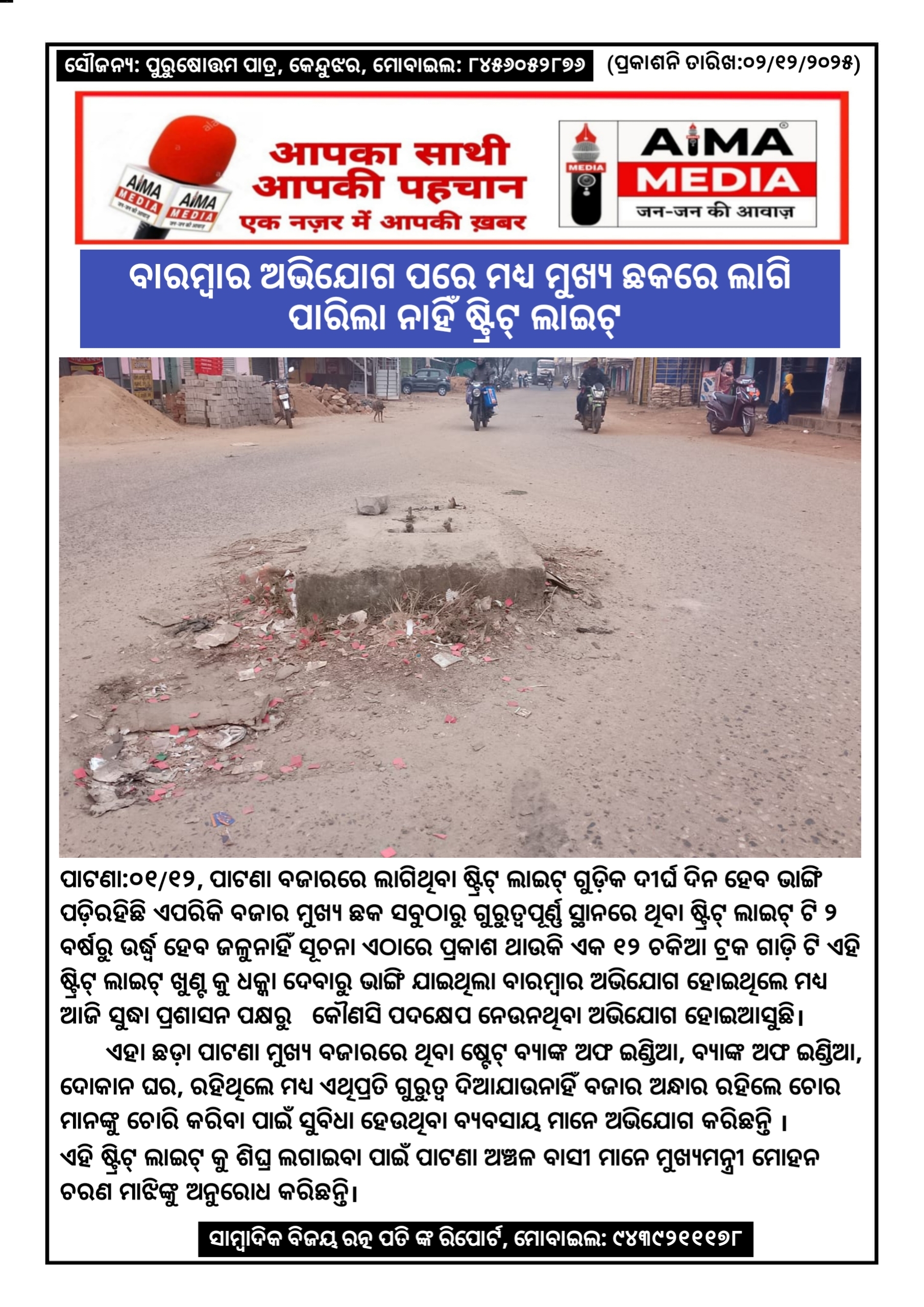 ବାରମ୍ବାର ଅଭିଯୋଗ ପରେ ମଧ୍ଯ ମୁଖ୍ୟ ଛକରେ ଲାଗି ପାରିଲା ନାହିଁ ଷ୍ଟ୍ରିଟ୍ ଲାଇଟ୍। ପାଟଣା:୦୧/୧୨, ପାଟଣା ବଜାରରେ ଲାଗିଥିବା ଷ୍ଟ୍ରିଟ୍ ଲାଇଟ୍ ଗୁଡ଼ିକ ଦୀର୍ଘ ଦିନ ହେବ ଭାଙ୍ଗି ପଡ଼ିରହିଛି ଏପରିକି ବଜାର ମୁଖ୍ୟ ଛକ ସବୁଠାରୁ ଗୁରୁତ୍ୱପୂର୍ଣ୍ଣ ସ୍ଥାନରେ ଥିବା ଷ୍ଟ୍ରିଟ୍ ଲାଇଟ୍ ଟି ୨ ବର୍ଷରୁ ଉର୍ଦ୍ଧ୍ବ ହେବ ଜଳୁନାହିଁ ସୂଚନା ଏଠାରେ ପ୍ରକାଶ ଥାଉକି ଏକ ୧୨ ଚକିଆ ଟ୍ରକ ଗାଡ଼ି ଟି ଏହି ଷ୍ଟ୍ରିଟ୍ ଲାଇଟ୍ ଖୁଣ୍ଟ କୁ ଧକ୍କା ଦେବାରୁ ଭାଙ୍ଗି ଯାଇଥିଲା ବାରମ୍ବାର ଅଭିଯୋଗ ହୋଇଥିଲେ ମଧ୍ୟ ଆଜି ସୁଦ୍ଧା ପ୍ରଶାସନ ପକ୍ଷରୁ କୌଣସି ପଦକ୍ଷେପ ନେଉନଥିବା ଅଭିଯୋଗ ହୋଇଆସୁଛି। ଏହା ଛଡ଼ା ପାଟଣା ମୁଖ୍ୟ ବଜାରରେ ଥିବା ଷ୍ଟେଟ୍ ବ୍ୟାଙ୍କ ଅଫ ଇଣ୍ଡିଆ, ବ୍ୟାଙ୍କ ଅଫ ଇଣ୍ଡିଆ, ଦୋକାନ ଘର, ରହିଥିଲେ ମଧ୍ୟ ଏଥିପ୍ରତି ଗୁରୁତ୍ବ ଦିଆଯାଉ ନାହିଁ। ବଜାର ଅନ୍ଧାର ରହିଲେ ଚୋର ମାନଙ୍କୁ ଚୋରି କରିବା ପାଇଁ ସୁବିଧା ହେଉଥିବା ବ୍ୟବସାୟ ମାନେ ଅଭିଯୋଗ କରିଛନ୍ତି। ଏହି ଷ୍ଟ୍ରିଟ୍ ଲାଇଟ୍ କୁ ଶିଘ୍ର ଲଗାଇବା ପାଇଁ ପାଟଣା ଅଞ୍ଚଳ ବାସୀ ମାନେ ମୁଖ୍ୟମନ୍ତ୍ରୀ ମୋହନ ଚରଣ ମାଝିଙ୍କୁ ଅନୁରୋଧ କରିଛନ୍ତି।ସାମ୍ବାଦିକ ବିଜୟ ରତ୍ନ ପତି ଙ୍କ ରିପୋର୍ଟ, ମୋବାଇଲ: ୯୪୩୯୨୧୧୧୭୮
