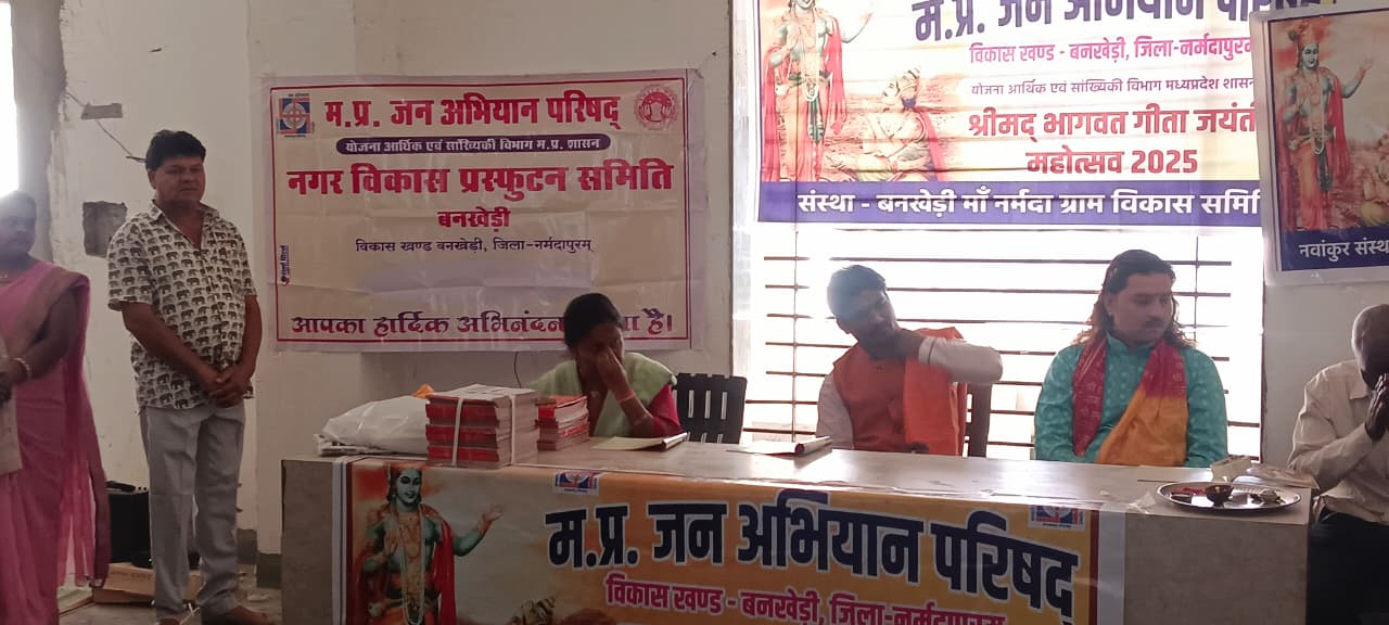 मध्यप्रदेश जन अभियान परिषद् के निर्देश अनुसार परिषद् की नवांकुर संस्था मां नर्मदा ग्राम विकास समिति नगर विकास प्रस्फुटन समिति,एवं विलेज लाइफ वेलफेयर सोसायटी के संयुक्त तत्वावधान में शासकीय सांदीपनी हायर सेकेण्डरी स्कूल है बनखेडी के सभागार में श्रीमद् गीता जयंती महोत्सव का कार्यक्रम आयोजन किया गया। भगवान श्री कृष्ण एवं गीता जी के छायाचित्र पर दीप प्रज्वलित समस्त गीता प्रेमियों ने जय कारे लगाकर शुभारंभ कर सभी छात्र-छात्राओं एवं शिक्षकों को श्रीमद्भागवत गीता पुस्तकों का वितरण नगर विकास प्रस्फुटन समिति के अध्यक्ष कमलेश नामदेव ने किया