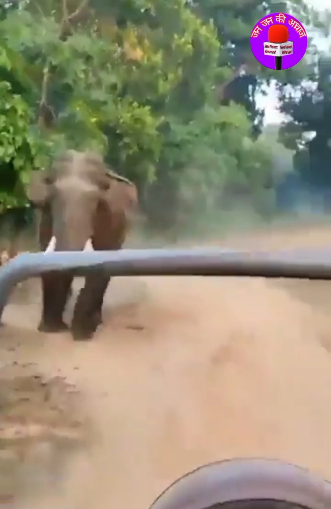 उत्तरप्रदेश के बिजनौर के अमानगढ़ टाइगर रिज़र्व में जंगल सफारी के दौरान एक हाथी अचानक पर्यटकों की जिप्सी के पीछे दौड़ पड़ा ।