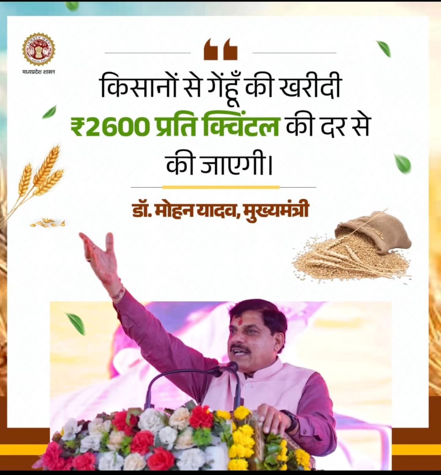 किसानों से गेंहूँ की खरीदी ₹𝟐𝟔𝟎𝟎 प्रति क्विंटल की दर से की जाएगी।