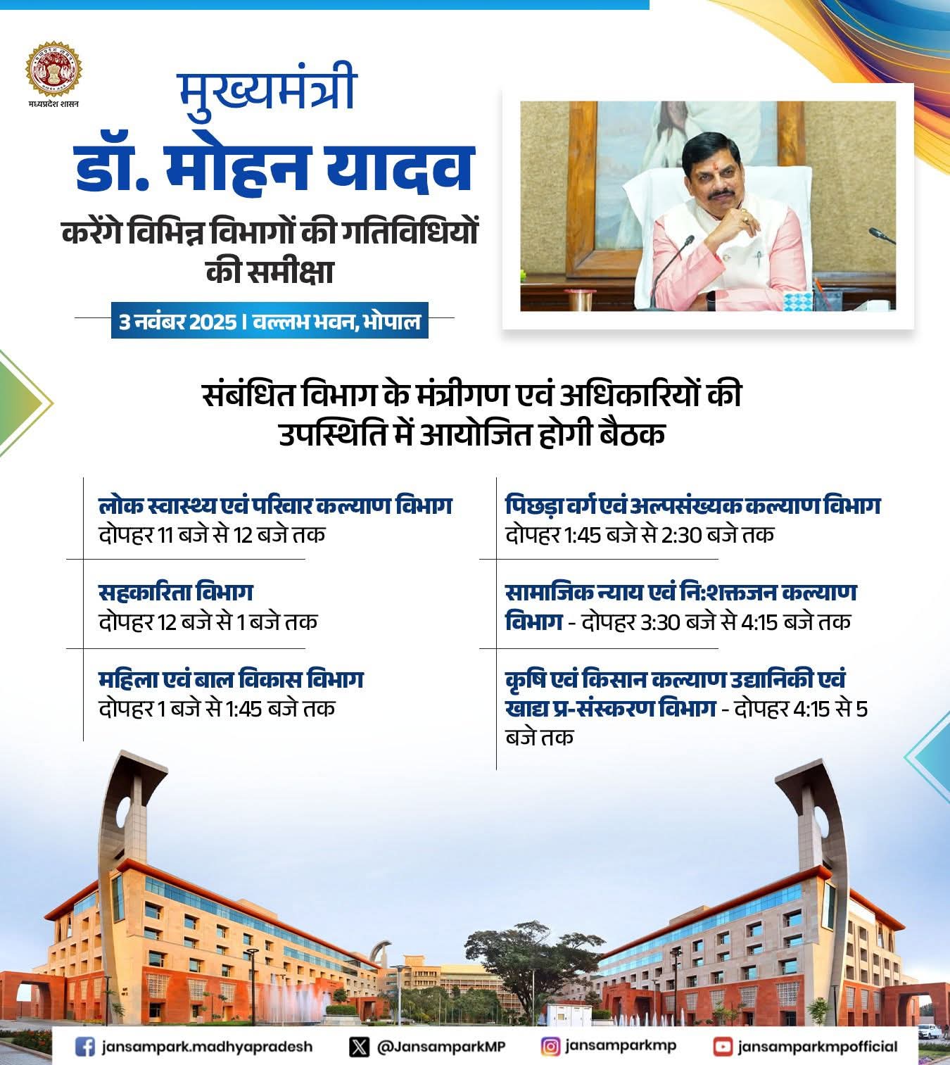 मुख्यमंत्री डॉ. मोहन यादव विभिन्न विभागों की समीक्षा बैठक करेंगे