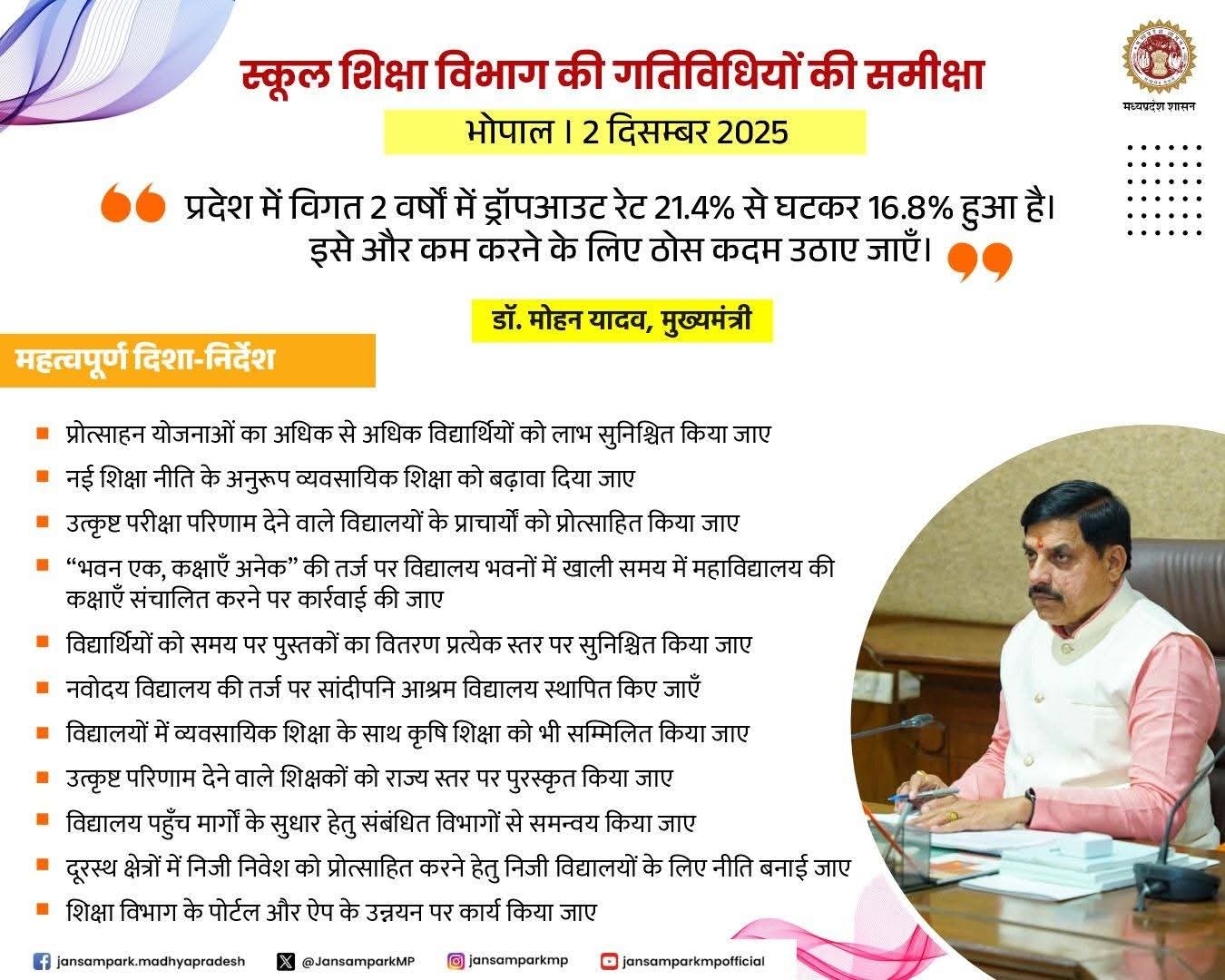➡️प्रदेश में विगत 2 वर्षों में ड्रॉपआउट रेट 21.4% से घटकर 16.8% हुआ है। इसे और कम करने के लिए ठोस कदम उठाए जाएं