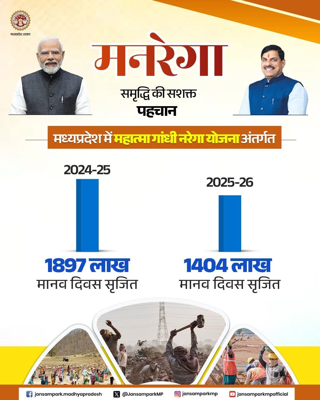 मनरेगासमृद्धि की सशक्त पहचानमध्यप्रदेश में महात्मा गांधी नरेगा योजना अंतर्गत 2024-25 में 1,897 लाख और 2025-26 में 1,404 लाख मानव दिवस हुए सृजित#CMMadhyaPradesh #NREGA_MP #JansamparkMP