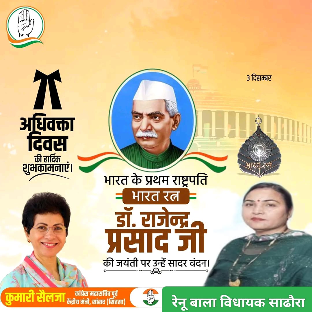 कपूरी :- आज 3 दिसंबर 2025, हल्का सधौरा विधायक मैडम रेणु बाला जी नें डा. राजेंद्र प्रशाद जी की जयंती पर सादर नमन किया, "''जो बात सिद्धांत में गलत है, वह बात व्यवहार में भी सही नहीं है।''