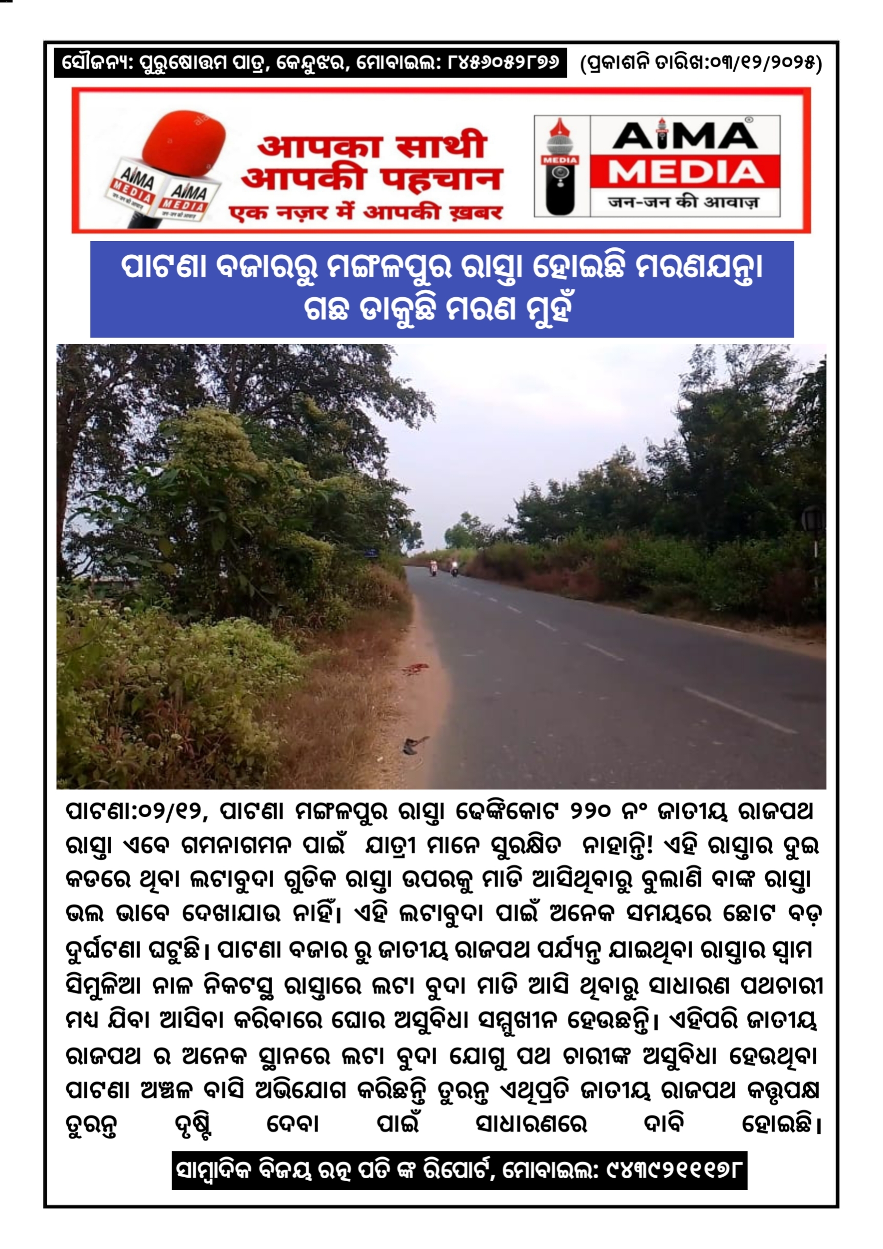 ପାଟଣା:୨/୧୨,ପାଟଣା ମଙ୍ଗଳପୁର ରାସ୍ତା ଢେଙ୍କିକୋଟ ୨୨୦ ନଂ ଜାତୀୟ ରାଜପଥ ରାସ୍ତା ଏବେ ଗମନାଗମନ ପାଇଁ ଯାତ୍ରୀ ମାନେ ସୁରକ୍ଷିତ ନାହାନ୍ତି ଏହି ରାସ୍ତାର ଦୁଇ କଡରେ ଥିବା ଲଟାବୁଦା ଗୁଡିକ ରାସ୍ତା ଉପରକୁ ମାଡି ଆସିଥିବାରୁ ବୁଲାଣି ବାଙ୍କ ରାସ୍ତା ଭଲ ଭାବେ ଦେଖାଯାଉ ନାହିଁ।ଏହି ଲଟାବୁଦା ପାଇଁ ଅନେକ ସମୟରେ ଛୋଟ ବଡ଼ ଦୁର୍ଘଟଣା ଘଟୁଛି।ପାଟଣା ବଜାର ରୁ ଜାତୀୟ ରାଜପଥ ପର୍ଯ୍ୟନ୍ତ ଯାଇଥିବା ରାସ୍ତାର ସ୍ୱାମ ସିମୁଳିଆ ନାଳ ନିକଟସ୍ଥ ରାସ୍ତାରେ ଲଟା ବୁଦା ମାଡି ଆସି ଥିବାରୁ ସାଧାରଣ ପଥଚାରୀ ମଧ୍ୟ ଯିବା ଆସିବା କରିବାରେ ଘୋର ଅସୁବିଧା ସମ୍ମୁଖୀନ ହେଉଛନ୍ତି।ଏହିପରି ଜାତୀୟ ରାଜପଥ ର ଅନେକ ସ୍ଥାନରେ ଲଟା ବୁଦା ଯୋଗୁ ପଥ ଚାରୀଙ୍କ ଅସୁବିଧା ହେଉଥିବା ପାଟଣା ଅଞ୍ଚଳ ବାସି ଅଭିଯୋଗ କରିଛନ୍ତି ତୁରନ୍ତ ଏଥିପ୍ରତି ଜାତୀୟ ରାଜପଥ କତ୍ତୃପକ୍ଷ ତୁରନ୍ତ ଦୃଷ୍ଟି ଦେବା ପାଇଁ ସାଧାରଣରେ ଦାବି ହୋଇଛି ।