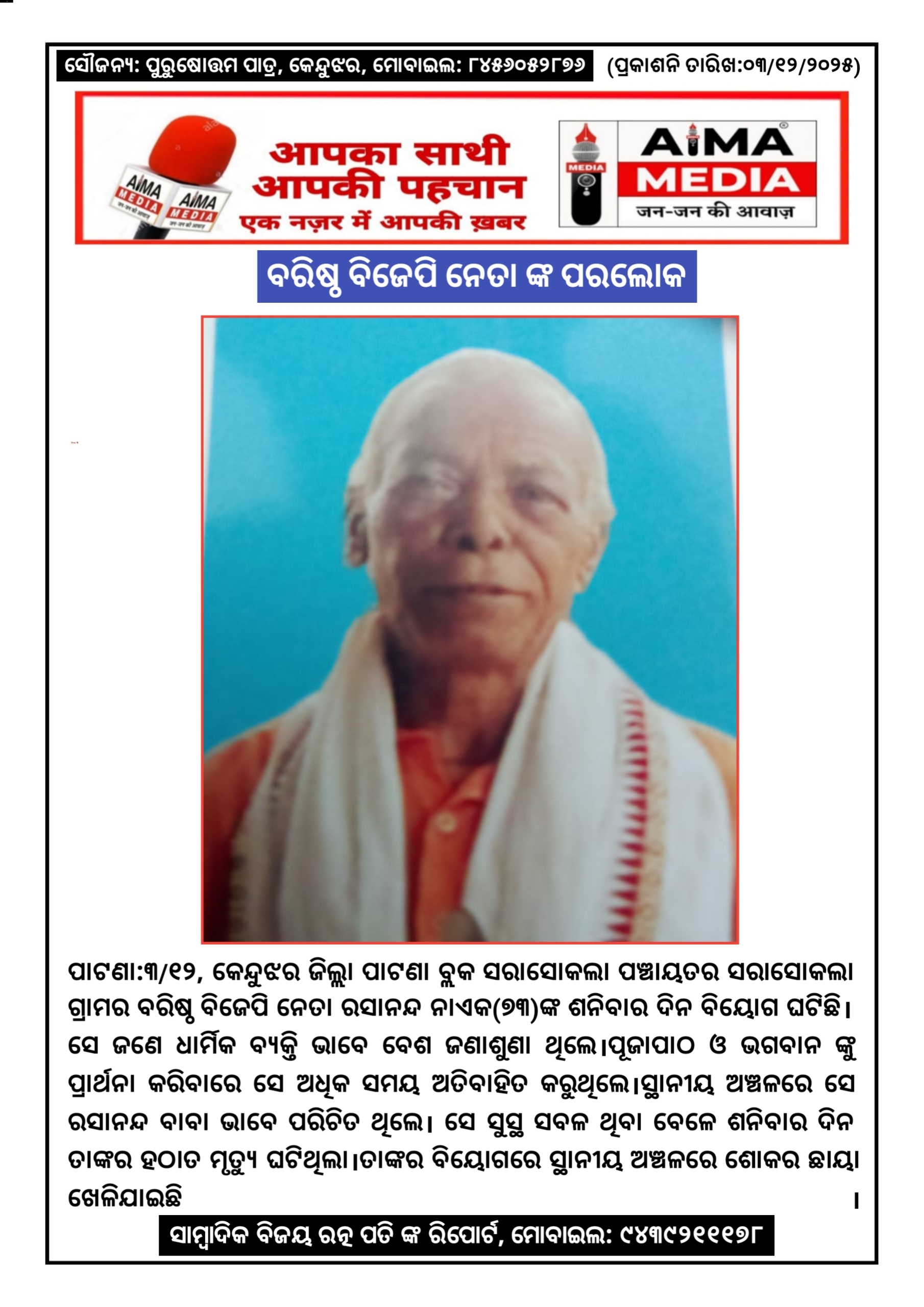 ପାଟଣା:୩/୧୨, କେନ୍ଦୁଝର ଜିଲ୍ଲା ପାଟଣା ବ୍ଲକ ସରାସୋକଲା ପଞ୍ଚାୟତର ସରାସୋକଲା ଗ୍ରାମର ବରିଷ୍ଠ ବିଜେପି ନେତା ରସାନନ୍ଦ ନାଏକ(୭୩)ଙ୍କ ଶନିବାର ବିୟୋଗ ଘଟିଛି।ସେ ଜଣେ ଧାର୍ମିକ ବ୍ୟକ୍ତି ଭାବେ ବେଶ ଜଣାଶୁଣା ଥିଲେ।ପୂଜାପାଠ ଓ ଭଗବାନ ଙ୍କୁ ପ୍ରାର୍ଥନା କରିବାରେ ସେ ଅଧିକ ସମୟ ଅତିବାହିତ କରୁଥିଲେ।ସ୍ଥାନୀୟ ଅଞ୍ଚଳରେ ସେ ରସାନନ୍ଦ ବାବା ଭାବେ ପରିଚିତ ଥିଲେ।ସେ ସୁସ୍ଥ ସବଳ ଥିବା ବେଳେ ଶନିବାର ତାଙ୍କର ହଠାତ ମୃତ୍ୟୁ ଘଟିଥିଲା।ତାଙ୍କର ବିୟୋଗରେ ସ୍ଥାନୀୟ ଅଞ୍ଚଳରେ ଶୋକର ଛାୟା ଖେଳିଯାଇଛି ।
