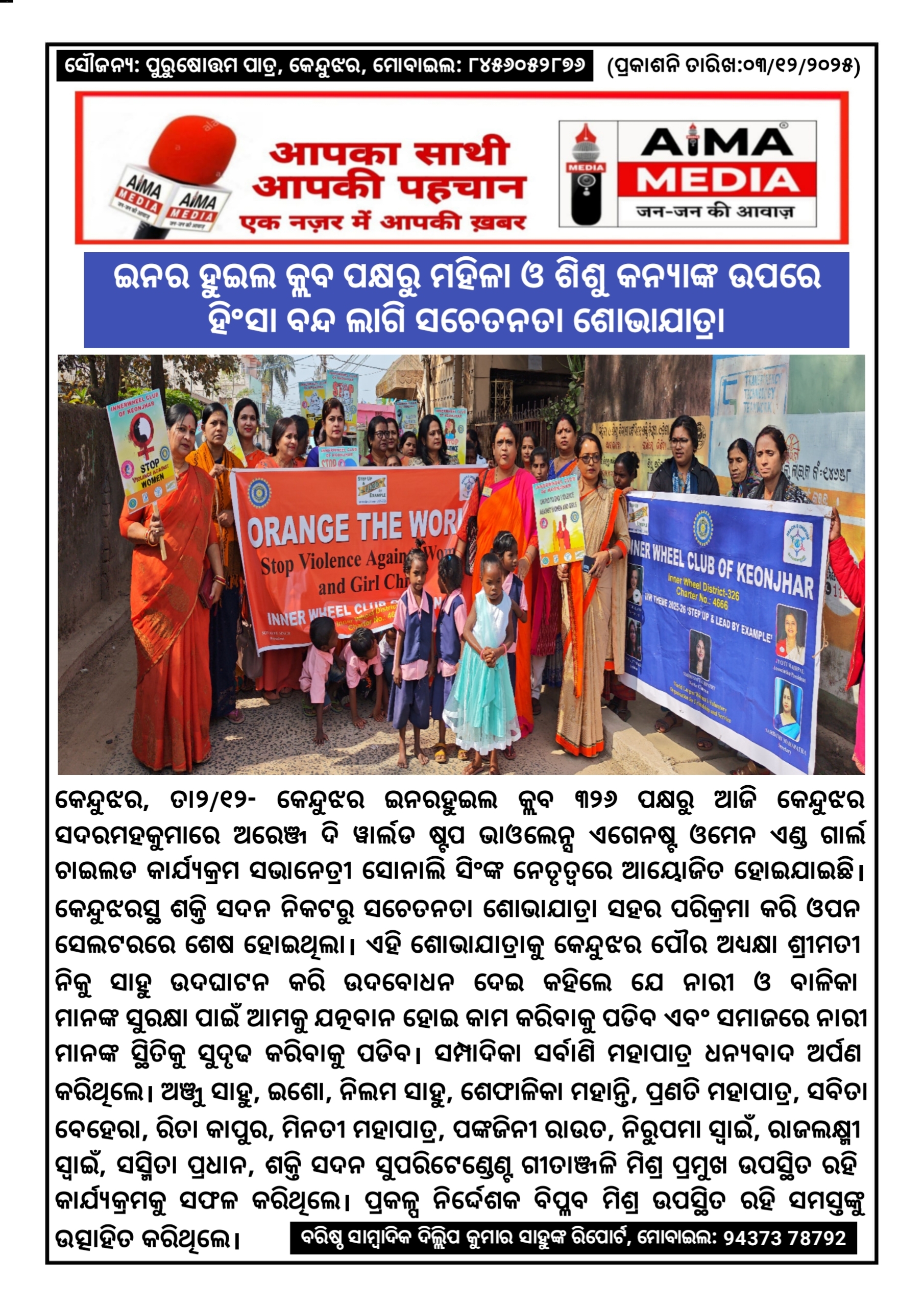 କେନ୍ଦୁଝର, ତା୨/୧୨- କେନ୍ଦୁଝର ଇନରହୁଇଲ କ୍ଲବ ୩୨୬ ପକ୍ଷରୁ ଆଜି କେନ୍ଦୁଝର ସଦରମହକୁମାରେ ଅରେଞ୍ଜ ଦି ୱାର୍ଲଡ ଷ୍ଟପ ଭାଓଲେନ୍ସ ଏଗେନଷ୍ଟ ଓମେନ ଏଣ୍ଡ ଗାର୍ଲ ଚାଇଲଡ କାର୍ଯ୍ୟକ୍ରମ ସଭାନେତ୍ରୀ ସୋନାଲି ସିଂଙ୍କ ନେତୃତ୍ୱରେ ଆୟୋଜିତ ହୋଇଯାଇଛି। କେନ୍ଦୁଝରସ୍ଥ ଶକ୍ତି ସଦନ ନିକଟରୁ ସଚେତନତା ଶୋଭାଯାତ୍ରା ସହର ପରିକ୍ରମା କରି ଓପନ ସେଲଟରରେ ଶେଷ ହୋଇଥିଲା। ଏହି ଶୋଭାଯାତ୍ରାକୁ କେନ୍ଦୁଝର ପୌର ଅଧ୍ୟକ୍ଷା ଶ୍ରୀମତୀ ନିକୁ ସାହୁ ଉଦଘାଟନ କରି ଉଦବୋଧନ ଦେଇ କହିଲେ ଯେ ନାରୀ ଓ ବାଳିକା ମାନଙ୍କ ସୁରକ୍ଷା ପାଇଁ ଆମକୁ ଯତ୍ନବାନ ହୋଇ କାମ କରିବାକୁ ପଡିବ ଏବଂ ସମାଜରେ ନାରୀ ମାନଙ୍କ ସ୍ଥିତିକୁ ସୁଦୃଢ କରିବାକୁ ପଡିବ। ସମ୍ପାଦିକା ସର୍ବାଣି ମହାପାତ୍ର ଧନ୍ୟବାଦ ଅର୍ପଣ କରିଥିଲେ। ଅଞ୍ଜୁ ସାହୁ, ଇଶୋ, ନିଲମ ସାହୁ, ଶେଫାଳିକା ମହାନ୍ତି, ପ୍ରଣତି ମହାପାତ୍ର, ସବିତା ବେହେରା, ରିତା କାପୁର, ମିନତୀ ମହାପାତ୍ର, ପଙ୍କଜିନୀ ରାଉତ, ନିରୁପମା ସ୍ୱାଇଁ, ରାଜଲକ୍ଷ୍ମୀ ସ୍ୱାଇଁ, ସସ୍ମିତା ପ୍ରଧାନ, ଶକ୍ତି ସଦନ ସୁପରିଟେଣ୍ଡେଣ୍ଟ ଗୀତାଞ୍ଜଳି ମିଶ୍ର ପ୍ରମୁଖ ଉପସ୍ଥିତ ରହି କାର୍ଯ୍ୟକ୍ରମକୁ ସଫଳ କରିଥିଲେ। ପ୍ରକଳ୍ପ ନିର୍ଦ୍ଦେଶକ ବିପ୍ଳବ ମିଶ୍ର ଉପସ୍ଥିତ ରହି ସମସ୍ତଙ୍କୁ ଉତ୍ସାହିତ କରିଥିଲେ।