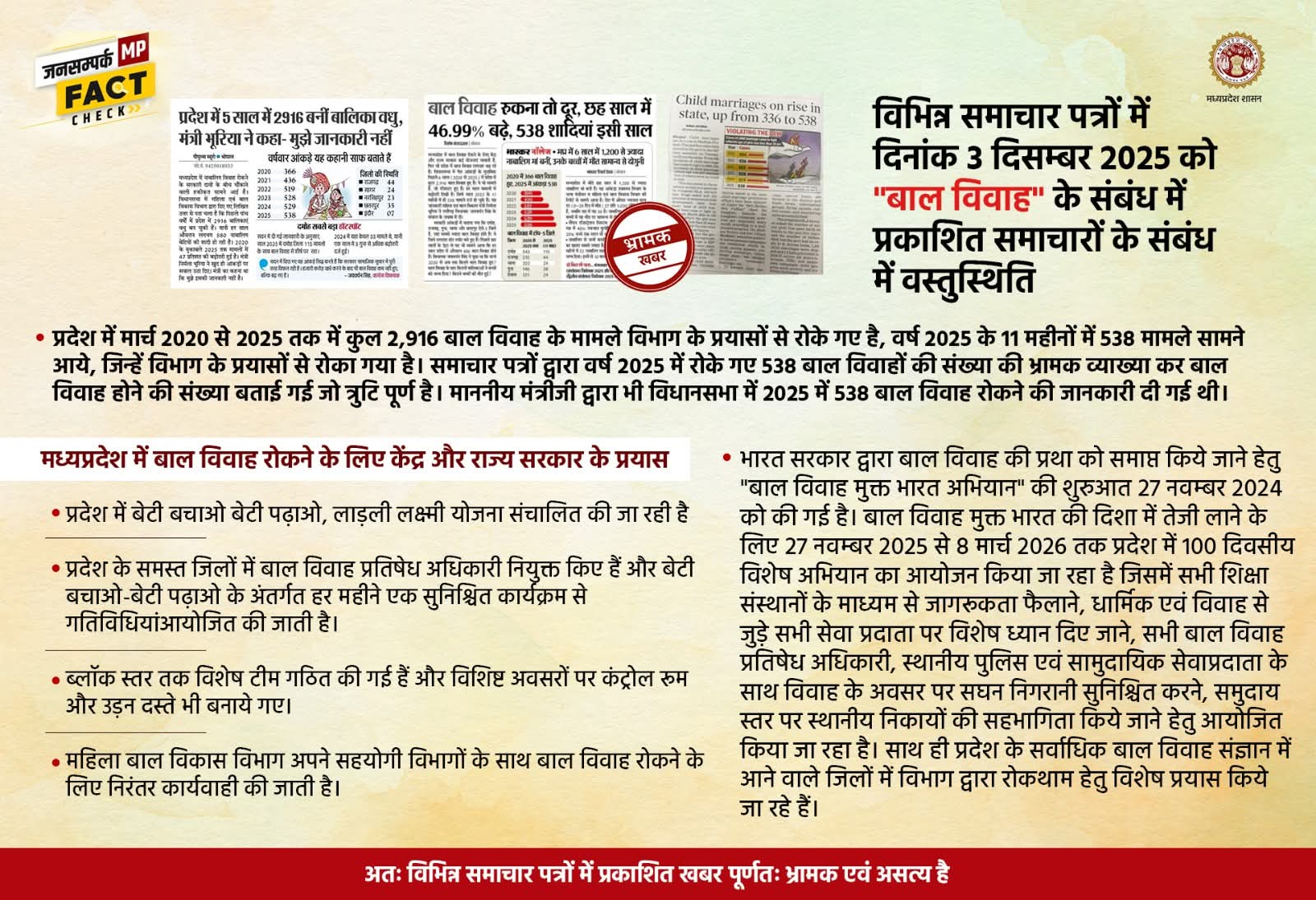 विभिन्न समाचार पत्रों में दिनांक 3 दिसम्बर 2025 को "बाल विवाह" के संबंध में प्रकाशित समाचारों के संबंध में वस्तुस्थिति