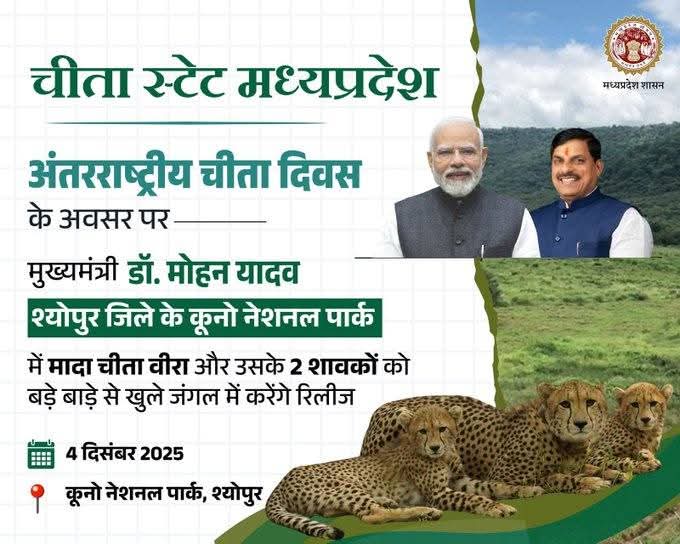 अंतरराष्ट्रीय चीता दिवस के अवसर पर मुख्यमंत्री डॉ. मोहन यादव श्योपुर जिले के कूनो नेशनल पार्क में तीन चीतों को बड़े बाड़े से खुले जंगल में करेंगे रिलीज