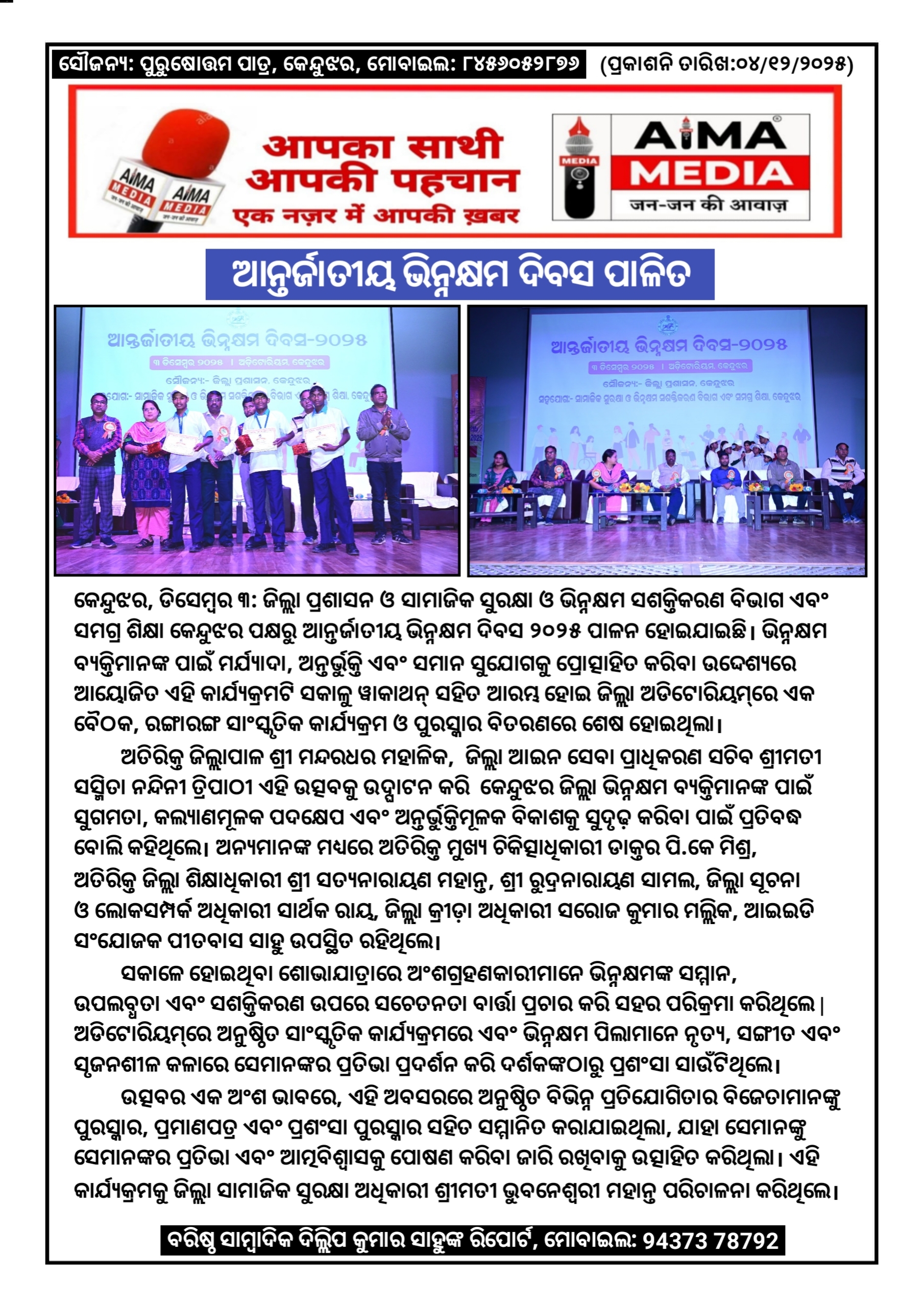 ଜିଲ୍ଲା ପ୍ରଶାସନ ଓ ସାମାଜିକ ସୁରକ୍ଷା ଓ ଭିନ୍ନକ୍ଷମ ସଶକ୍ତିକରଣ ବିଭାଗ ଏବଂ ସମଗ୍ର ଶିକ୍ଷା କେନ୍ଦୁଝର ପକ୍ଷରୁ ଆନ୍ତର୍ଜାତୀୟ ଭିନ୍ନକ୍ଷମ ଦିବସ ୨୦୨୫ ପାଳନ ହୋଇଯାଇଛି । ଭିନ୍ନକ୍ଷମ ବ୍ୟକ୍ତିମାନଙ୍କ ପାଇଁ ମର୍ଯ୍ୟାଦା, ଅନ୍ତର୍ଭୁକ୍ତି ଏବଂ ସମାନ ସୁଯୋଗକୁ ପ୍ରୋତ୍ସାହିତ କରିବା ଉଦ୍ଦେଶ୍ୟରେ ଆୟୋଜିତ ଏହି କାର୍ଯ୍ୟକ୍ରମଟି ସକାଳୁ ୱାକାଥନ୍ ସହିତ ଆରମ୍ଭ ହୋଇ ଜିଲ୍ଲା ଅଡିଟୋରିୟମ୍‌ରେ ଏକ ବୈଠକ, ରଙ୍ଗାରଙ୍ଗ ସାଂସ୍କୃତିକ କାର୍ଯ୍ୟକ୍ରମ ଓ ପୁରସ୍କାର ବିତରଣରେ ଶେଷ ହୋଇଥିଲା।
