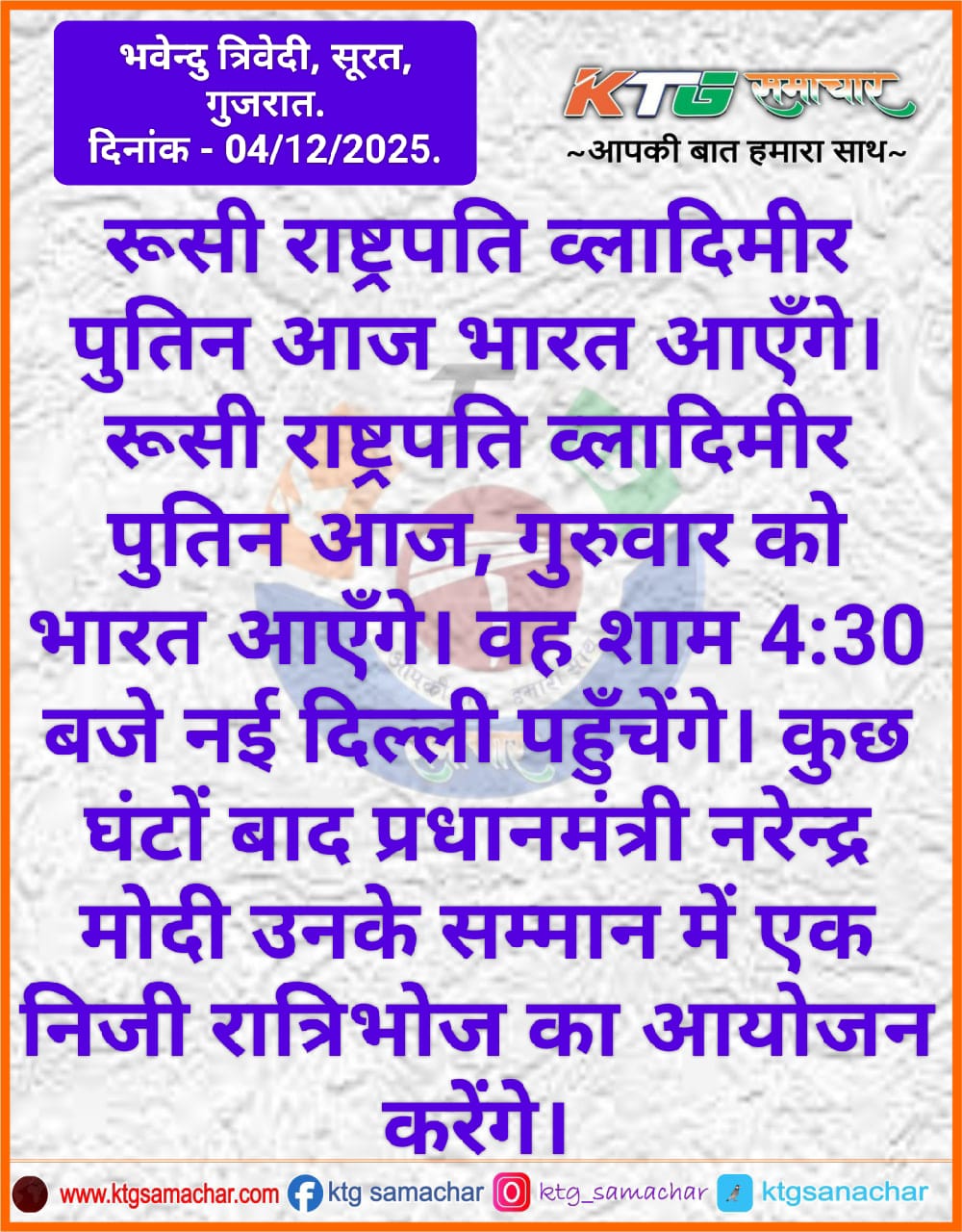 रूसी राष्ट्रपति पुतिन आज भारत आएंगे।