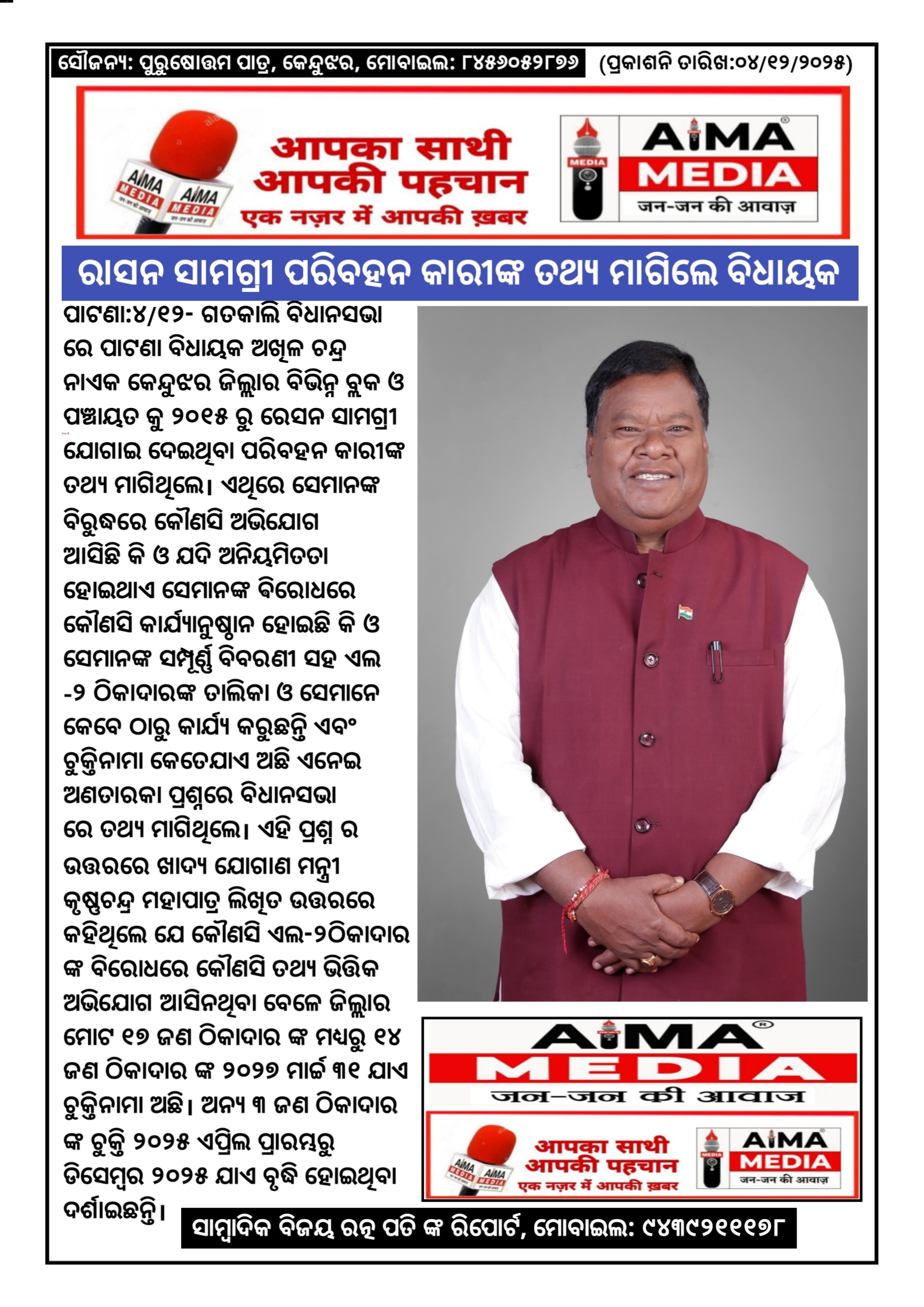 ପାଟଣା:୪/୧୨- ଗତକାଲି ବିଧାନସଭା ରେ ପାଟଣା ବିଧାୟକ ଅଖିଳ ଚନ୍ଦ୍ର ନାଏକ କେନ୍ଦୁଝର ଜିଲ୍ଲାର ବିଭିନ୍ନ ବ୍ଲକ ଓ ପଞ୍ଚାୟତ କୁ ୨୦୧୫ ରୁ ରେସନ ସାମଗ୍ରୀ ଯୋଗାଇ ଦେଇଥିବା ପରିବହନ କାରୀଙ୍କ ତଥ୍ୟ ମାଗିଥିଲେ। ଏଥିରେ ସେମାନଙ୍କ ବିରୁଦ୍ଧରେ କୌଣସି ଅଭିଯୋଗ ଆସିଛି କି ଓ ଯଦି ଅନିୟମିତତା ହୋଇଥାଏ ସେମାନଙ୍କ ଵିରୋଧରେ କୌଣସି କାର୍ଯ୍ୟାନୁଷ୍ଠାନ ହୋଇଛି କି ଓ ସେମାନଙ୍କ ସମ୍ପୂର୍ଣ୍ଣ ବିବରଣୀ ସହ ଏଲ -୨ ଠିକାଦାରଙ୍କ ତାଲିକା ଓ ସେମାନେ କେବେ ଠାରୁ କାର୍ଯ୍ୟ କରୁଛନ୍ତି ଏବଂ ଚୁକ୍ତିନାମା କେତେଯାଏ ଅଛି ଏନେଇ ଅଣତାରକା ପ୍ରଶ୍ନରେ ବିଧାନସଭା ରେ ତଥ୍ୟ ମାଗିଥିଲେ। ଏହି ପ୍ରଶ୍ନ ର ଉତ୍ତରରେ ଖାଦ୍ୟ ଯୋଗାଣ ମନ୍ତ୍ରୀ କୃଷ୍ଣଚନ୍ଦ୍ର ମହାପାତ୍ର ଲିଖିତ ଉତ୍ତରରେ କହିଥିଲେ ଯେ କୌଣସି ଏଲ-୨ଠିକାଦାର ଙ୍କ ବିରୋଧରେ କୌଣସି ତଥ୍ୟ ଭିତ୍ତିକ ଅଭିଯୋଗ ଆସିନଥିବା ବେଳେ ଜିଲ୍ଲାର ମୋଟ ୧୭ ଜଣ ଠିକାଦାର ଙ୍କ ମଧ୍ୟରୁ ୧୪ ଜଣ ଠିକାଦାର ଙ୍କ ୨୦୨୭ ମାର୍ଚ୍ଚ ୩୧ ଯାଏ ଚୁକ୍ତିନାମା ଅଛି। ଅନ୍ୟ ୩ ଜଣ ଠିକାଦାର ଙ୍କ ଚୁକ୍ତି ୨୦୨୫ ଏପ୍ରିଲ ପ୍ରାରମ୍ଭରୁ ଡିସେମ୍ବର ୨୦୨୫ ଯାଏ ବୃଦ୍ଧି ହୋଇଥିବା ଦର୍ଶାଇଛନ୍ତି।