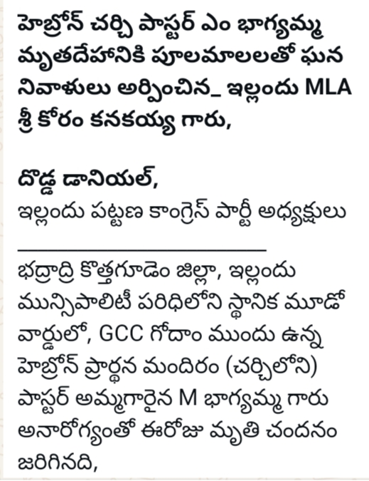 Bhadari kothagudem district yellandu mandal yellandu senior pastor ammagaru died