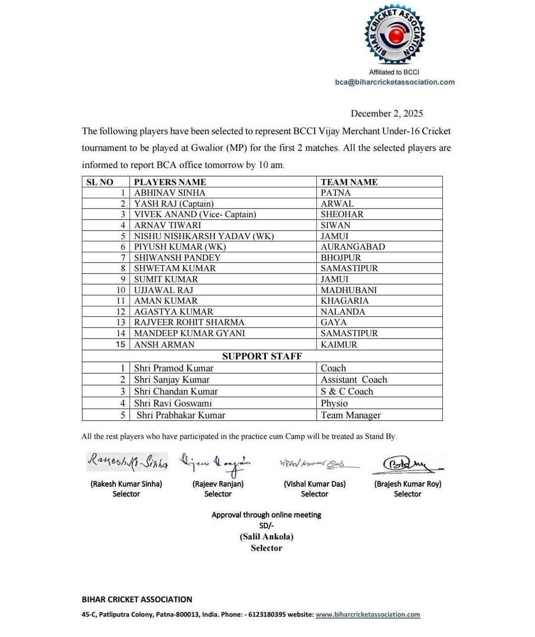 Under 16 Bihar cricket 16 सदस्यीय टीम