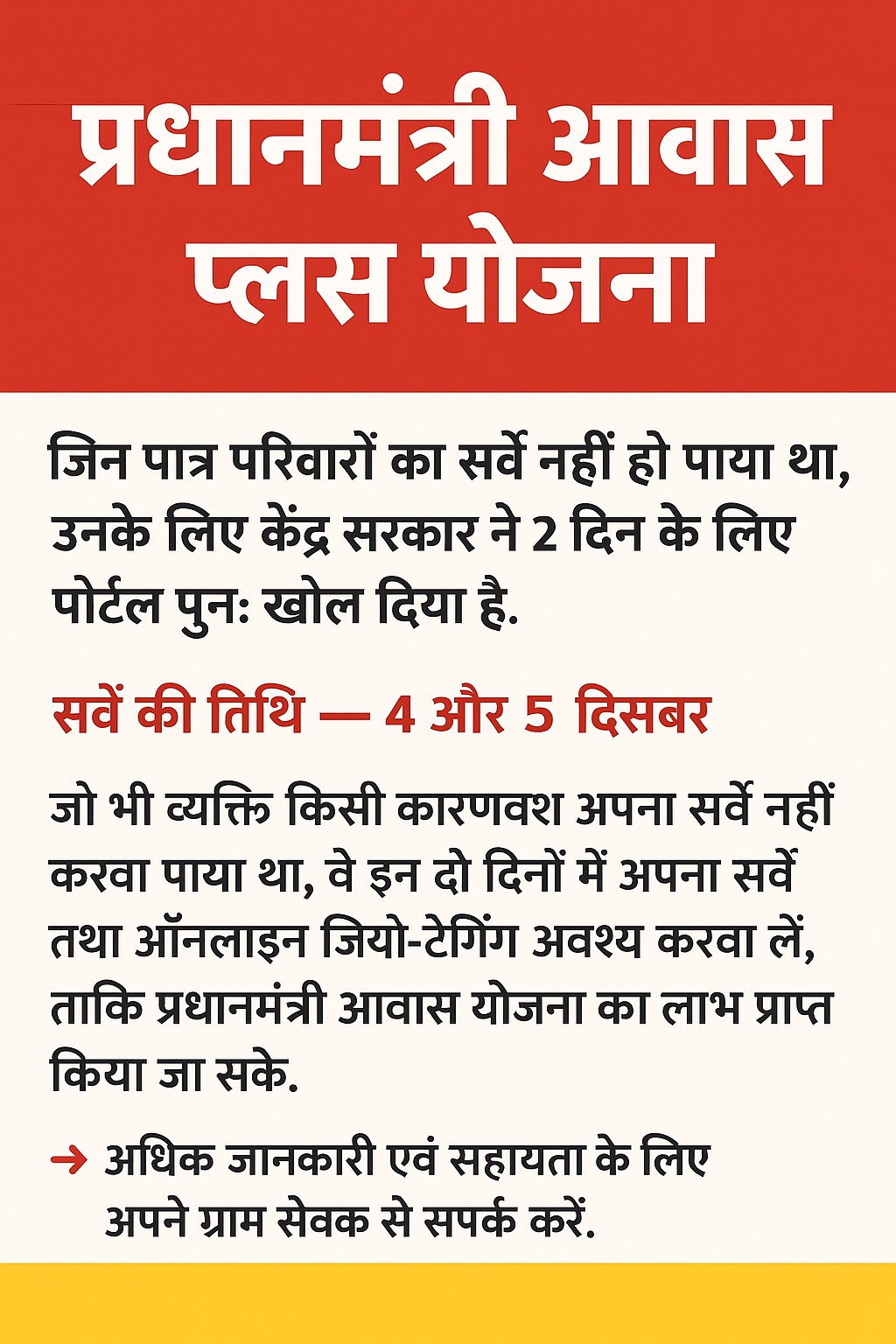 प्रधानमंत्री आवास प्लस योजना जिन पात्र परिवारों का सर्वे नहीं हो पाया था, उनके लिए केंद्र सरकार ने 2 दिन के लिए पोर्टल पुनः खोल दिया है।