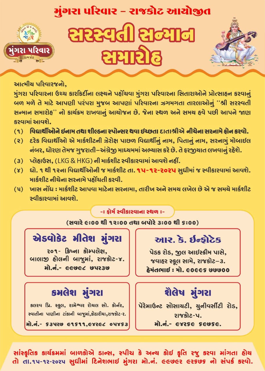 मुंगरा परिवार के उज्ज्वल सितारों को सम्मानित करने हेतु फॉर्म भरने की अंतिम तिथि 15/12/2025 रखी गई है। फॉर्म भरने का स्थान, पता और समय कार्ड दिया गया है। यह सरस्वती सम्मान मुंगरा परिवार के बच्चों को उच्च शिक्षा के लिए प्रोत्साहित करने का एक भव्य आयोजन है। इसके लिए समय और तारीख बाद में तय की जाएगी.. जिसमें मुंगरा परिवार के पदाधिकारी, मुंगरा परिवार के समाजसेवी, परिवार के सामाजिक नेता, मुंगरा परिवार के राजनीतिक नेता, विधायक, मुंगरा परिवार के प्रत्येक पार्टी के नेता, अधिवक्ता, डॉक्टर, मुंगरा परिवार के पुलिस कर्मचारी, मुंगरा परिवार के पुलिस अधिकारी, मुंगरा परिवार के बड़ा गांव के आई श्री खोडियार मंदिर के ट्रस्टी, विभिन्न सरकारी नौकरियां करने वाले मुंगरा परिवार के नौकरीपेशा, मुंगरा परिवार के पत्रकार और मीडिया मित्र, सामाजिक संगठनों के नेताओं के साथ-साथ मुंगरा परिवार और पुलिस मित्र संगठनों के सदस्य, मुंगरा परिवार के सैनिक और पूर्व सैनिक, मुंगरा परिवार के जामनगर के विभिन्न विभागों में कार्यरत अधिकारी और राजनीतिक नेताओं के साथ-साथ गुजरात राज्य की वर्तमान सरकार भी शामिल होगी।मुंगड़ा परिवार के पूर्व मंत्री एवं जामनगर के माननीय विधायक राधवजी भाई पटेल साहब एवं जामनगर जिले के भाजपा नेता। पूर्व राष्ट्रपति रमेशभाई डी.. मुंगरा साहब. पुलिस अधिकारी भरतभाई एन मुंगरा एएसआई (एलसीबी) के साथ-साथ सूर्यपारा गांव के पूर्व उपसरपंच लोपेशभाई मुंगरा, सूर्यापारा गांव के नेता और जामनगर जिले के सामाजिक कार्यकर्ता और किसान नेता मुकेशकुमार ए मुंगरा, सूर्यापारा गांव के सरपंच मुकेशभाई के मुंगरा, जामनगर के उद्योगपति नाथाभाई मुंगरा, खोडलधाम के अध्यक्ष नरेशभाई पटेल साहेब और सभी प्रसिद्ध प्रदेश अध्यक्ष गुजरात