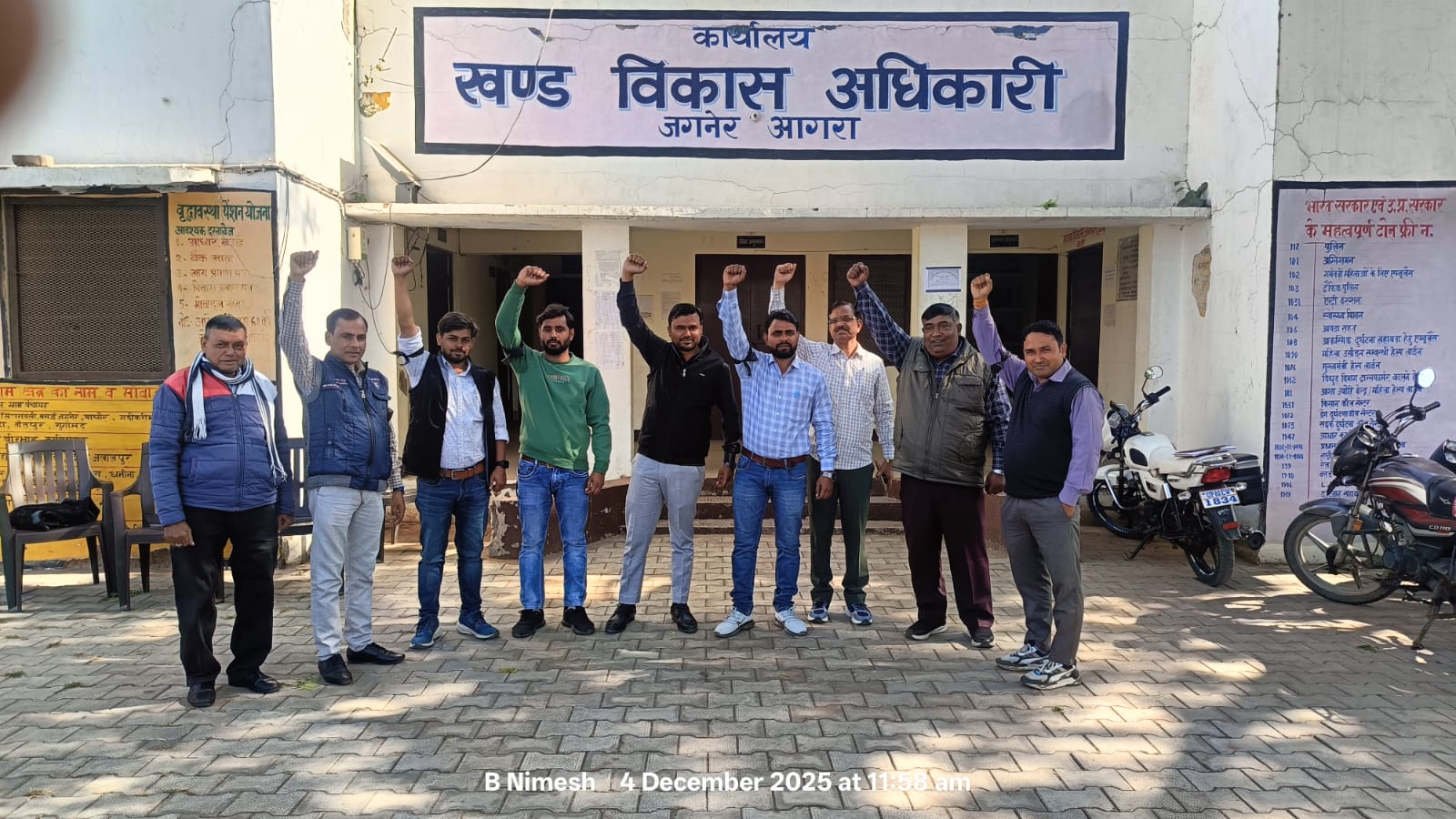 जगनेर ब्लॉक परिसर में ग्राम विकास एवं ग्राम पंचायत अधिकारियों ने लगातार चौथे दिन काली पट्टी बांधकर दर्ज जताया विरोध