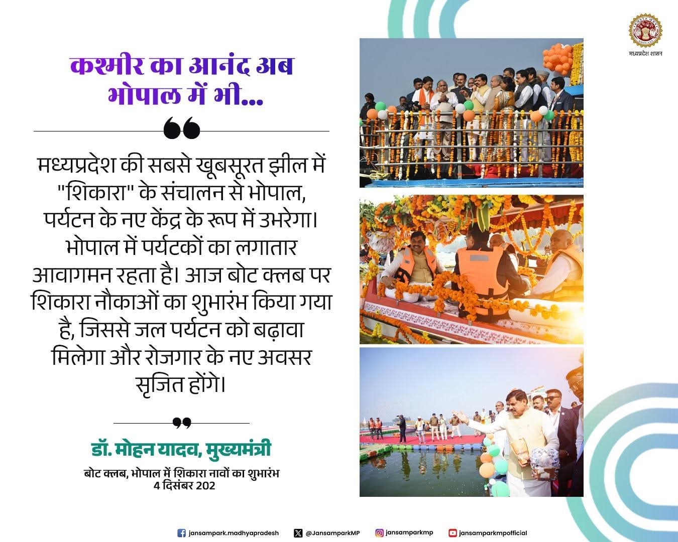 प्रदेश की सबसे खूबसूरत झील में "शिकारा" के संचालन से भोपाल, पर्यटन के नए केंद्र के रूप में उभरेगा।