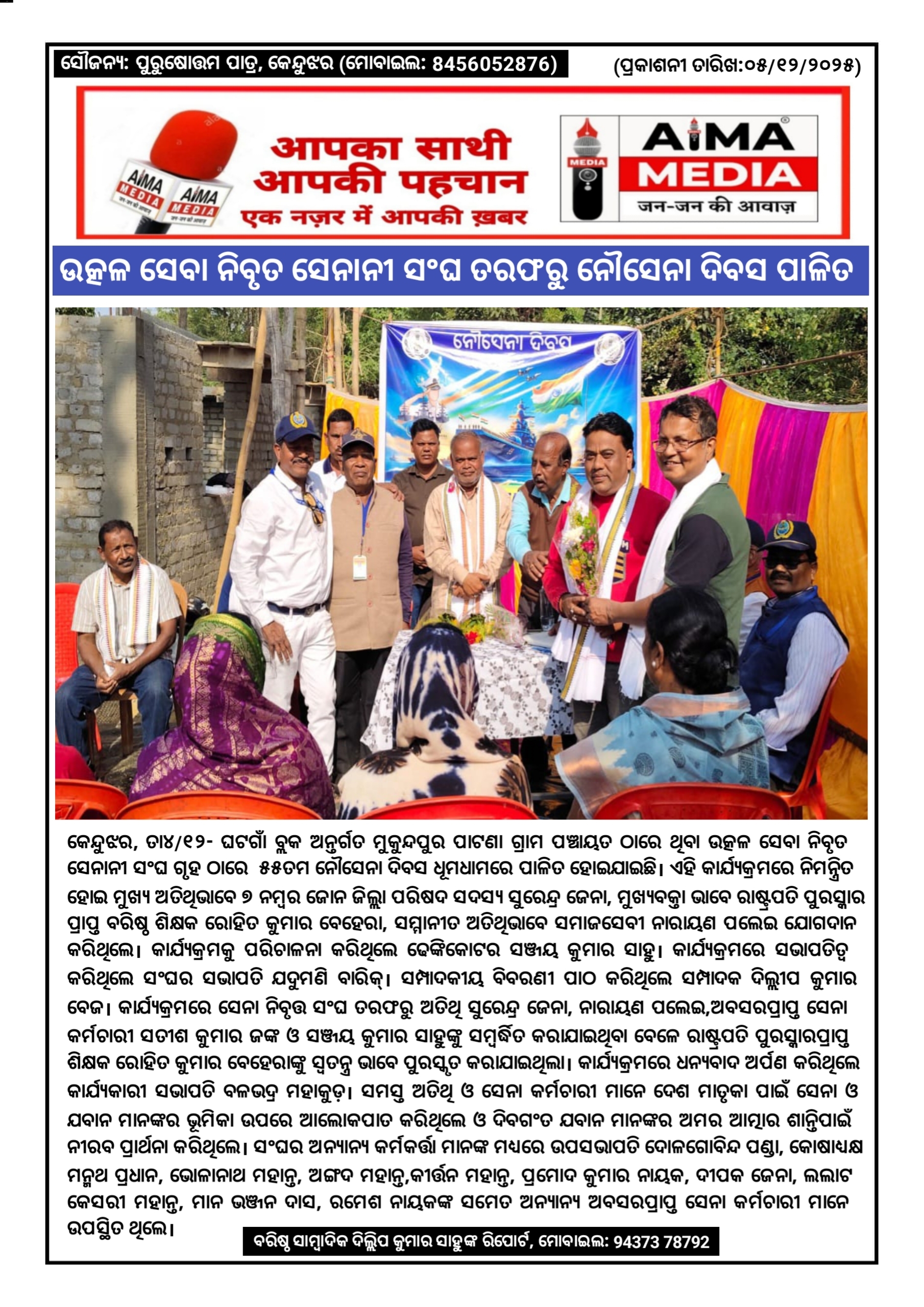 କେନ୍ଦୁଝର, ତା୪/୧୨- ଘଟଗାଁ ବ୍ଲକ ଅନ୍ତର୍ଗତ ମୁକୁନ୍ଦପୁର ପାଟଣା ଗ୍ରାମ ପଞ୍ଚାୟତ ଠାରେ ଥିବା ଉତ୍କଳ ସେବା ନିବୃତ ସେନାନୀ ସଂଘ ଗୃହ ଠାରେ ୫୫ତମ ନୌସେନା ଦିବସ ଧୂମଧାମରେ ପାଳିତ ହୋଇଯାଇଛି। ଏହି କାର୍ଯ୍ୟକ୍ରମରେ ନିମନ୍ତ୍ରିତ ହୋଇ ମୁଖ୍ୟ ଅତିଥିଭାବେ ୭ ନମ୍ବର ଜୋନ ଜିଲ୍ଲା ପରିଷଦ ସଦସ୍ୟ ସୁରେନ୍ଦ୍ର ଜେନା, ମୁଖ୍ୟବକ୍ତା ଭାବେ ରାଷ୍ଟ୍ରପତି ପୁରସ୍କାର ପ୍ରାପ୍ତ ବରିଷ୍ଠ ଶିକ୍ଷକ ରୋହିତ କୁମାର ବେହେରା, ସମ୍ମାନୀତ ଅତିଥିଭାବେ ସମାଜସେବୀ ନାରାୟଣ ପଲେଇ ଯୋଗଦାନ କରିଥିଲେ। କାର୍ଯ୍ୟକ୍ରମକୁ ପରିଚାଳନା କରିଥିଲେ ଢେଙ୍କିକୋଟର ସଞ୍ଜୟ କୁମାର ସାହୁ। କାର୍ଯ୍ୟକ୍ରମରେ ସଭାପତିତ୍ବ କରିଥିଲେ ସଂଘର ସଭାପତି ଯଦୁମଣି ବାରିକ୍। ସମ୍ପାଦକୀୟ ବିବରଣୀ ପାଠ କରିଥିଲେ ସମ୍ପାଦକ ଦିଲ୍ଲୀପ କୁମାର ବେଜ। କାର୍ଯ୍ୟକ୍ରମରେ ସେନା ନିବୃତ୍ତ ସଂଘ ତରଫରୁ ଅତିଥି ସୁରେନ୍ଦ୍ର ଜେନା, ନାରାୟଣ ପଲେଇ, ଅବସରପ୍ରାପ୍ତ ସେନା କର୍ମଚାରୀ ସତୀଶ କୁମାର ଜଙ୍କ ଓ ସଞ୍ଜୟ କୁମାର ସାହୁଙ୍କୁ ସମ୍ବର୍ଦ୍ଧିତ କରାଯାଇଥିବା ବେଳେ ରାଷ୍ଟ୍ରପତି ପୁରସ୍କାରପ୍ରାପ୍ତ ଶିକ୍ଷକ ରୋହିତ କୁମାର ବେହେରାଙ୍କୁ ସ୍ଵତନ୍ତ୍ର ଭାବେ ପୁରସ୍କୃତ କରାଯାଇଥିଲା। କାର୍ଯ୍ୟକ୍ରମରେ ଧନ୍ୟବାଦ ଅର୍ପଣ କରିଥିଲେ କାର୍ଯ୍ୟକାରୀ ସଭାପତି ବଳଭଦ୍ର ମହାକୁଡ଼। ସମସ୍ତ ଅତିଥି ଓ ସେନା କର୍ମଚାରୀ ମାନେ ଦେଶ ମାତୃକା ପାଇଁ ସେନା ଓ ଯବାନ ମାନଙ୍କର ଭୂମିକା ଉପରେ ଆଲୋକପାତ କରିଥିଲେ ଓ ଦିବଗଂତ ଯବାନ ମାନଙ୍କର ଅମର ଆତ୍ମାର ଶାନ୍ତିପାଇଁ ନୀରବ ପ୍ରାର୍ଥନା କରିଥିଲେ। ସଂଘର ଅନ୍ୟାନ୍ୟ କର୍ମକର୍ତ୍ତା ମାନଙ୍କ ମଧ୍ୟରେ ଉପସଭାପତି ଦୋଳଗୋବିନ୍ଦ ପଣ୍ଡା, କୋଷାଧ୍ୟକ୍ଷ ମନ୍ମଥ ପ୍ରଧାନ, ଭୋଳାନାଥ ମହାନ୍ତ,ଅଙ୍ଗଦ ମହାନ୍ତ, କୀର୍ତ୍ତନ ମହାନ୍ତ, ପ୍ରମୋଦ କୁମାର ନାୟକ, ଦୀପକ ଜେନା, ଲଲାଟ କେସରୀ ମହାନ୍ତ, ମାନ ଭଞ୍ଜନ ଦାସ, ରମେଶ ନାୟକଙ୍କ ସମେତ ଅନ୍ୟାନ୍ୟ ଅବସରପ୍ରାପ୍ତ ସେନା କର୍ମଚାରୀ ମାନେ ଉପସ୍ଥିତ ଥିଲେ।