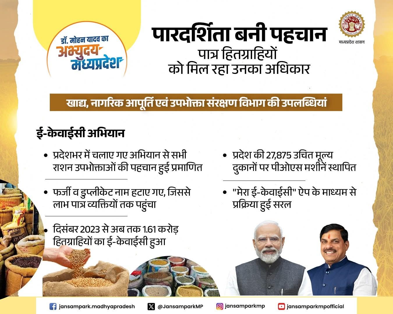 ➡️खाद्य, नागरिक आपूर्ति एवं उपभोक्ता संरक्षण विभाग द्वारा प्रदेशभर में चलाए गए ई-केवाईसी अभियान से उपभोक्ताओं की पहचान हुई प्रमाणित
