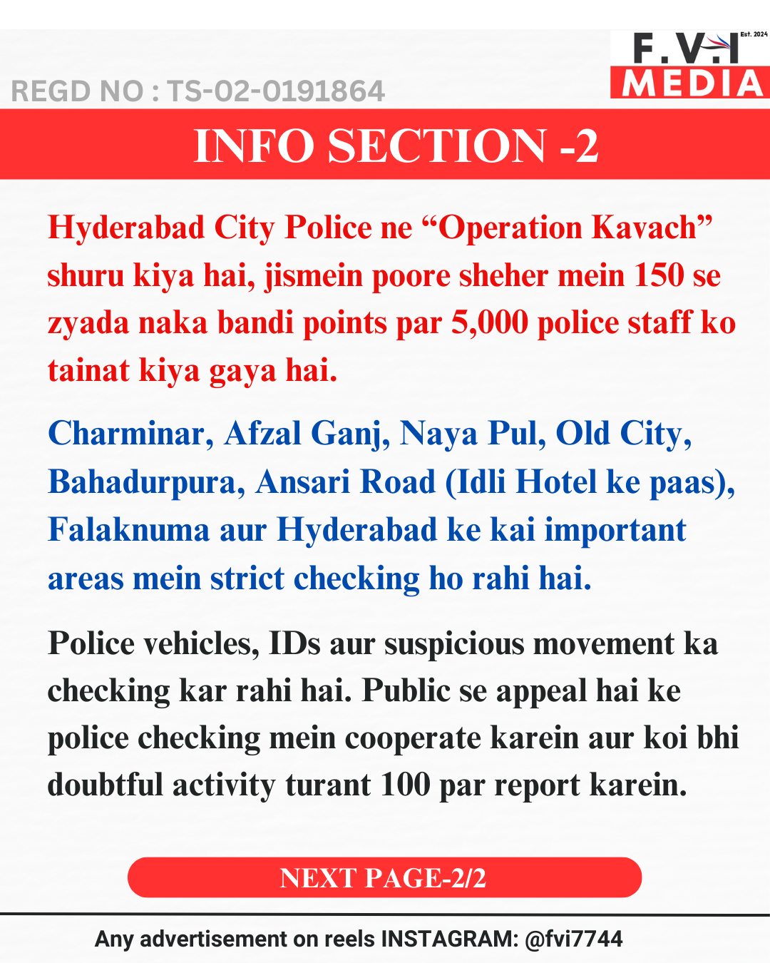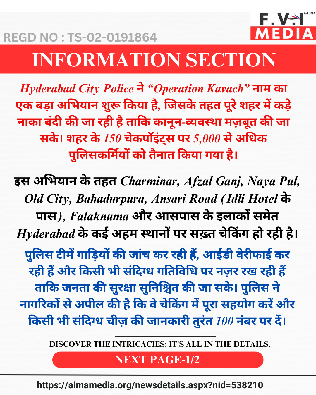 Hyderabad City Police has launched “Operation Kavach”, a large-scale naka bandi exercise across the city to strengthen law and order. More than 5,000 police personnel have been deployed at 150 checkpoints.